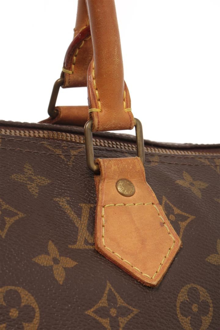 One Louis Vuitton Brown Monogram Speedy 35 Bandouliere. Item is sold AS-IS. All available information is listed in the description and shown in the photo. louis vuitton brown monogram canvas speedy 35 bandoulie satchel bag with gold-tone hardware, internal slip pocket, leather trim, two rolled top handles, main compartment top zip fastening. Depth 7.9 in, Handle 3.9 in, Height 9.1 in, Width 13.8 in / Depth 20 cm, Handle 10 cm, Height 23 cm, Width 35 cm