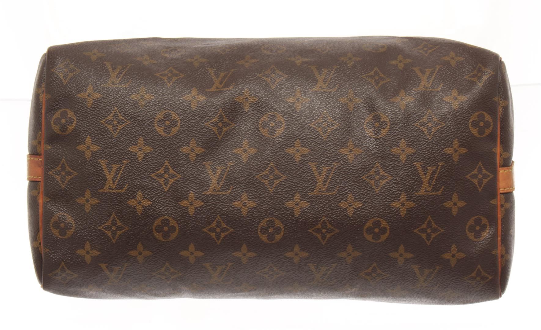 One Louis Vuitton Brown Monogram Speedy 35 Bandouliere. Item is sold AS-IS. All available information is listed in the description and shown in the photo. louis vuitton brown monogram canvas speedy 35 bandoulie satchel bag with gold-tone hardware, internal slip pocket, leather trim, two rolled top handles, main compartment top zip fastening. Depth 7.9 in, Handle 3.9 in, Height 9.1 in, Width 13.8 in / Depth 20 cm, Handle 10 cm, Height 23 cm, Width 35 cm