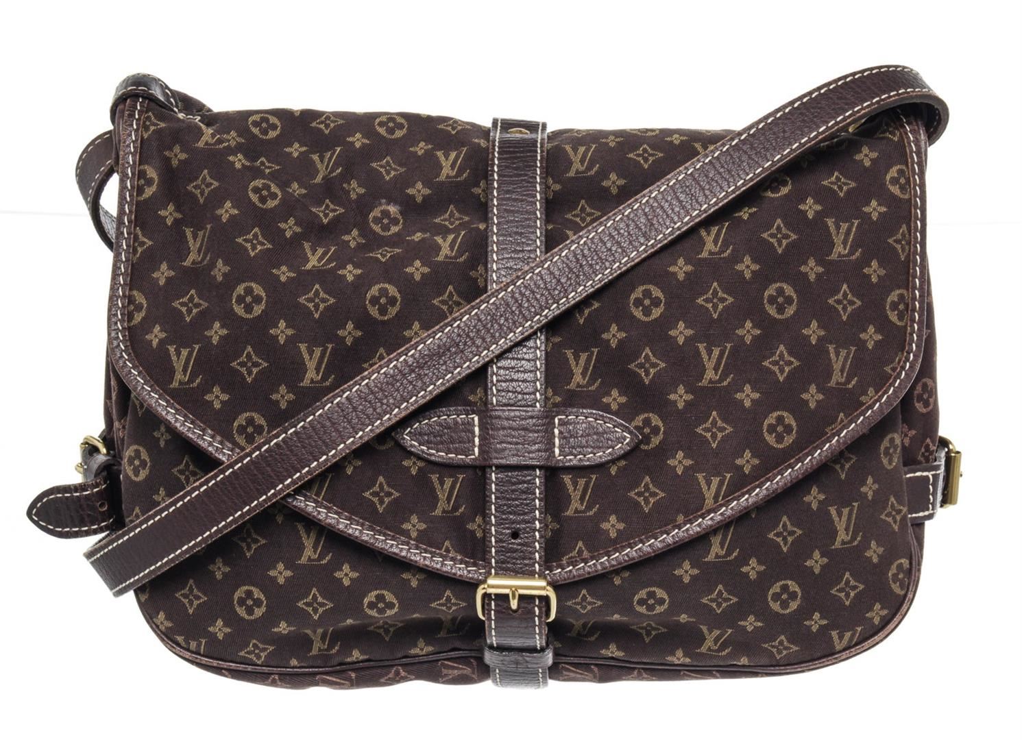 Louis Vuitton Brown Saumur 35cm Crossbody Bags with monogram canvas, gold ton hardware, tan vachetta leather trim, interior slip pockets, canvas lining, shoulder strap and trun-lock closures