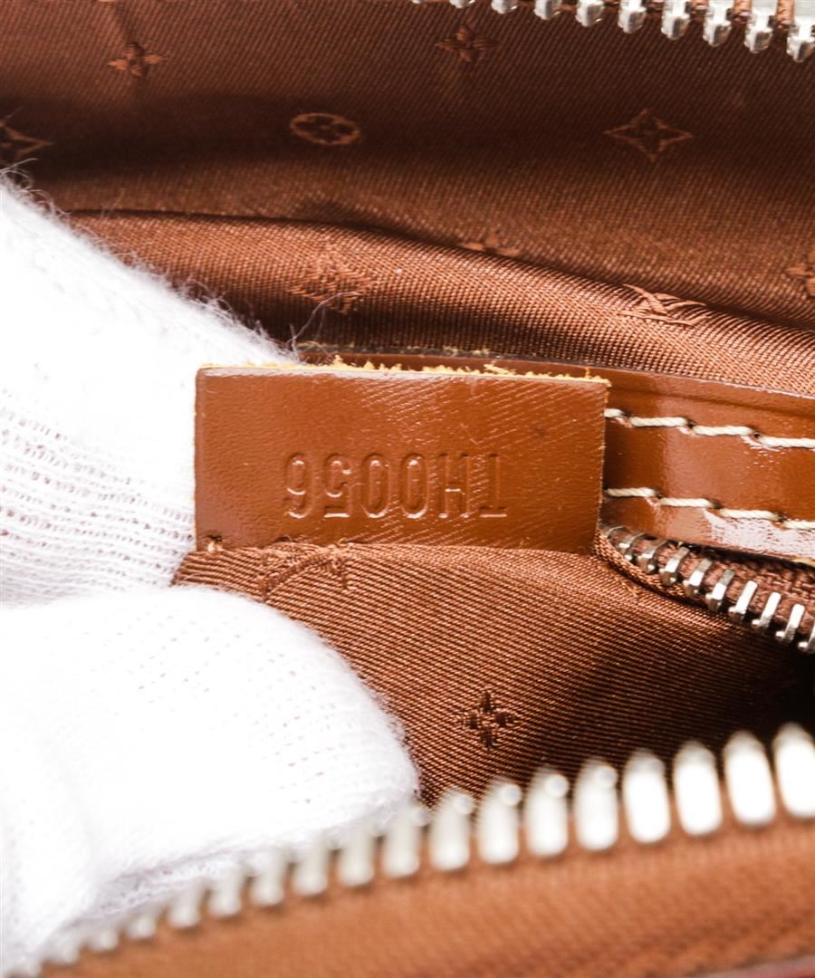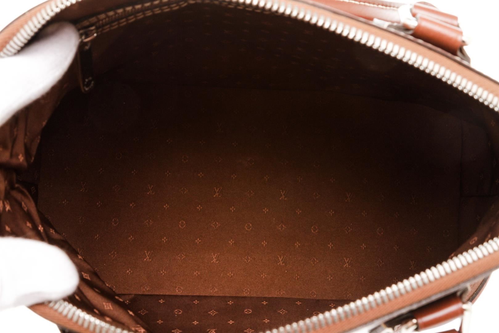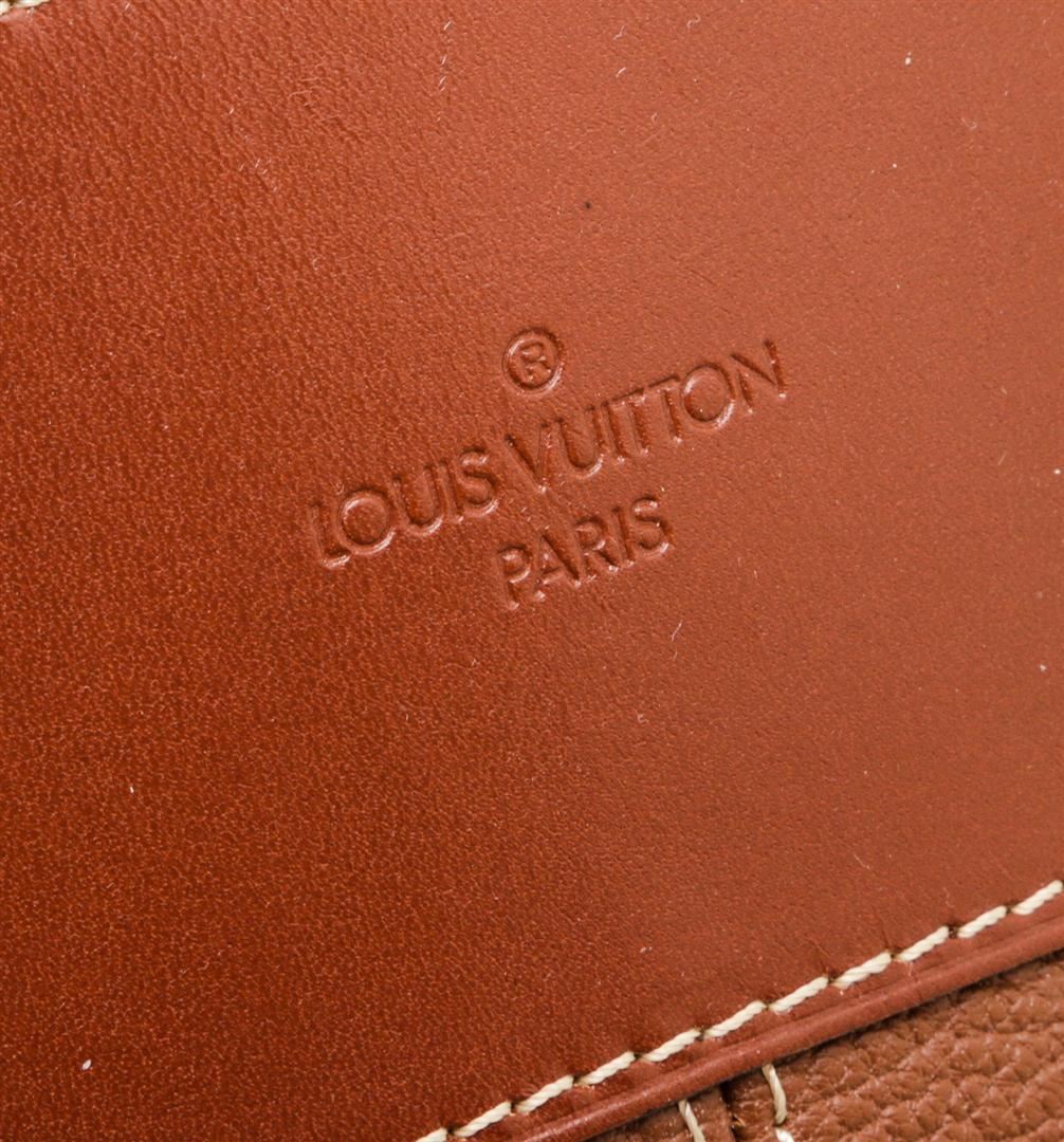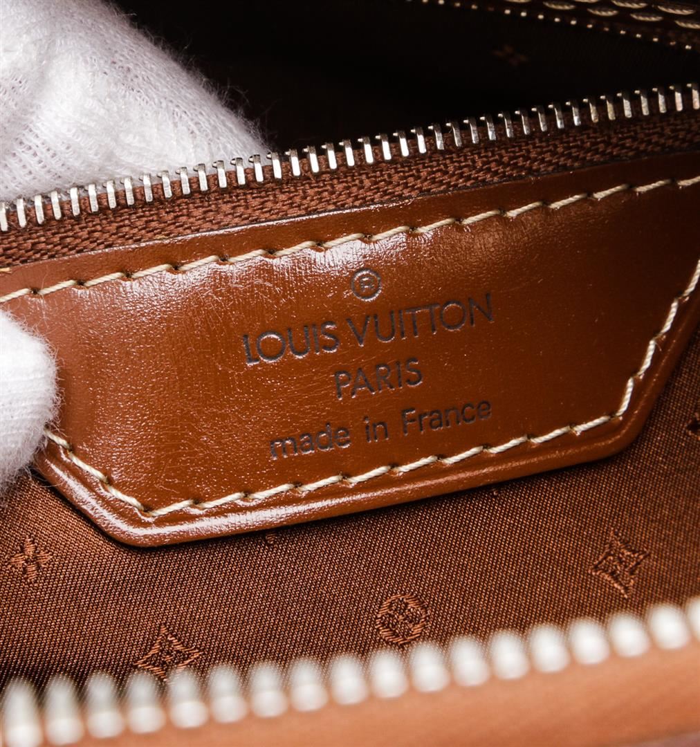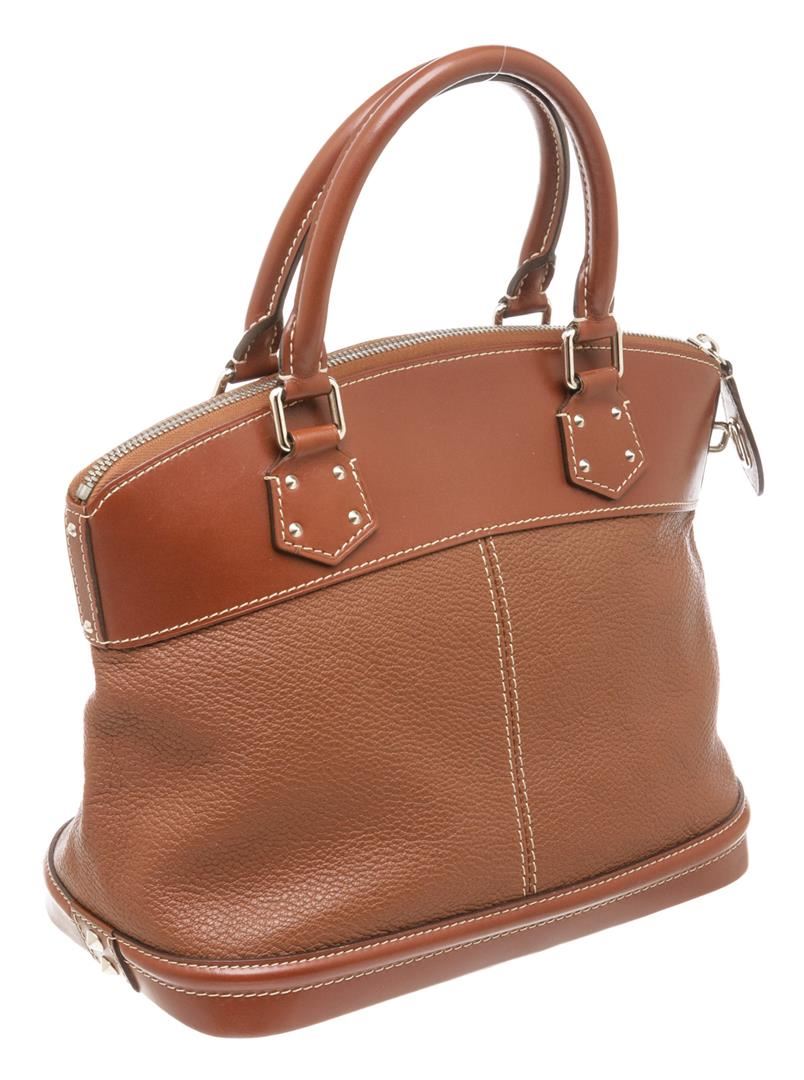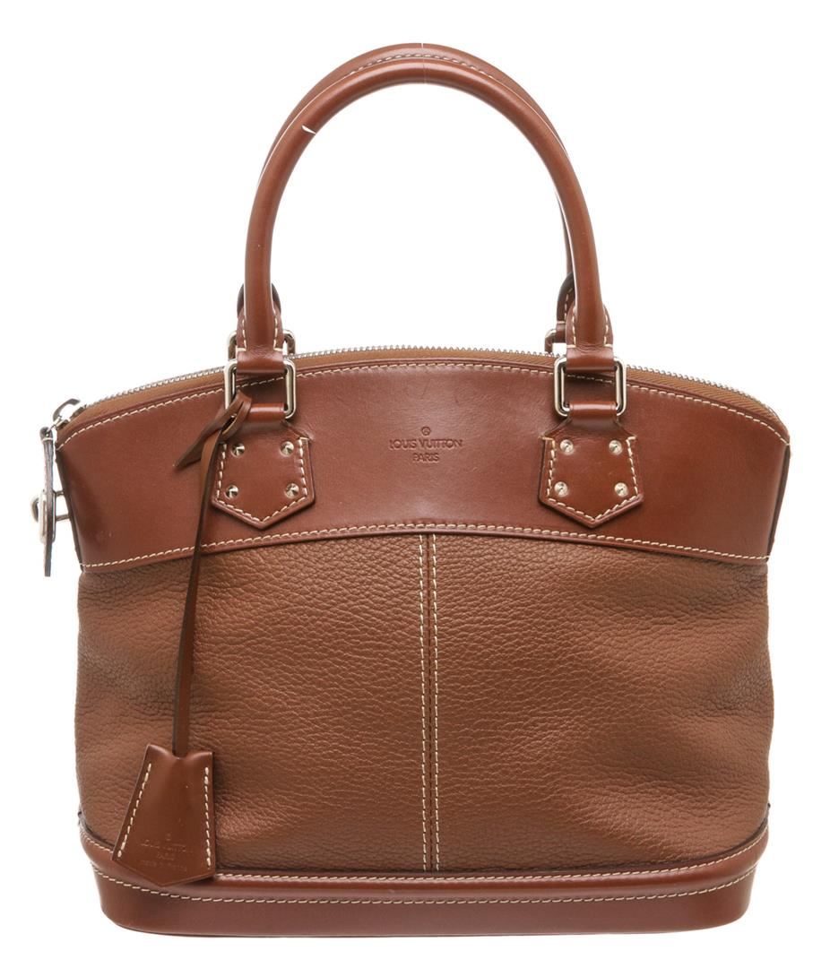 Leather Louis Vuitton Brown Suhali Lockit PM with brass hardware, contrast stitching throughout, dual rolled top handles, brown monogrammed woven lining, single zip pocket at interior walls and zip closure at top.