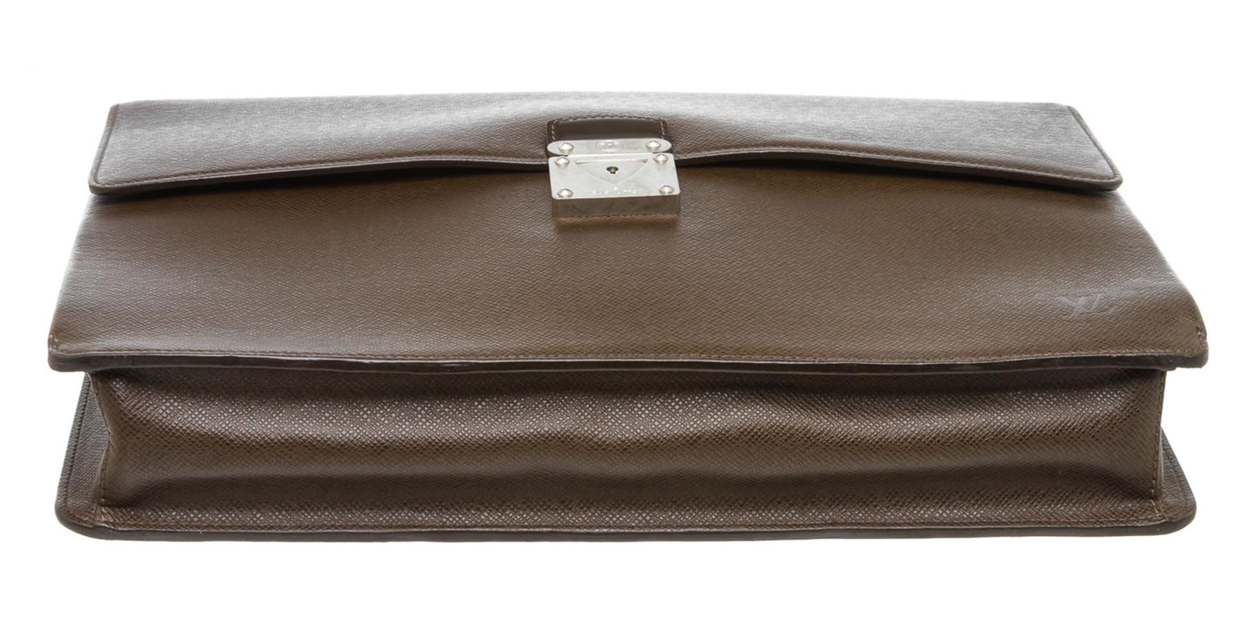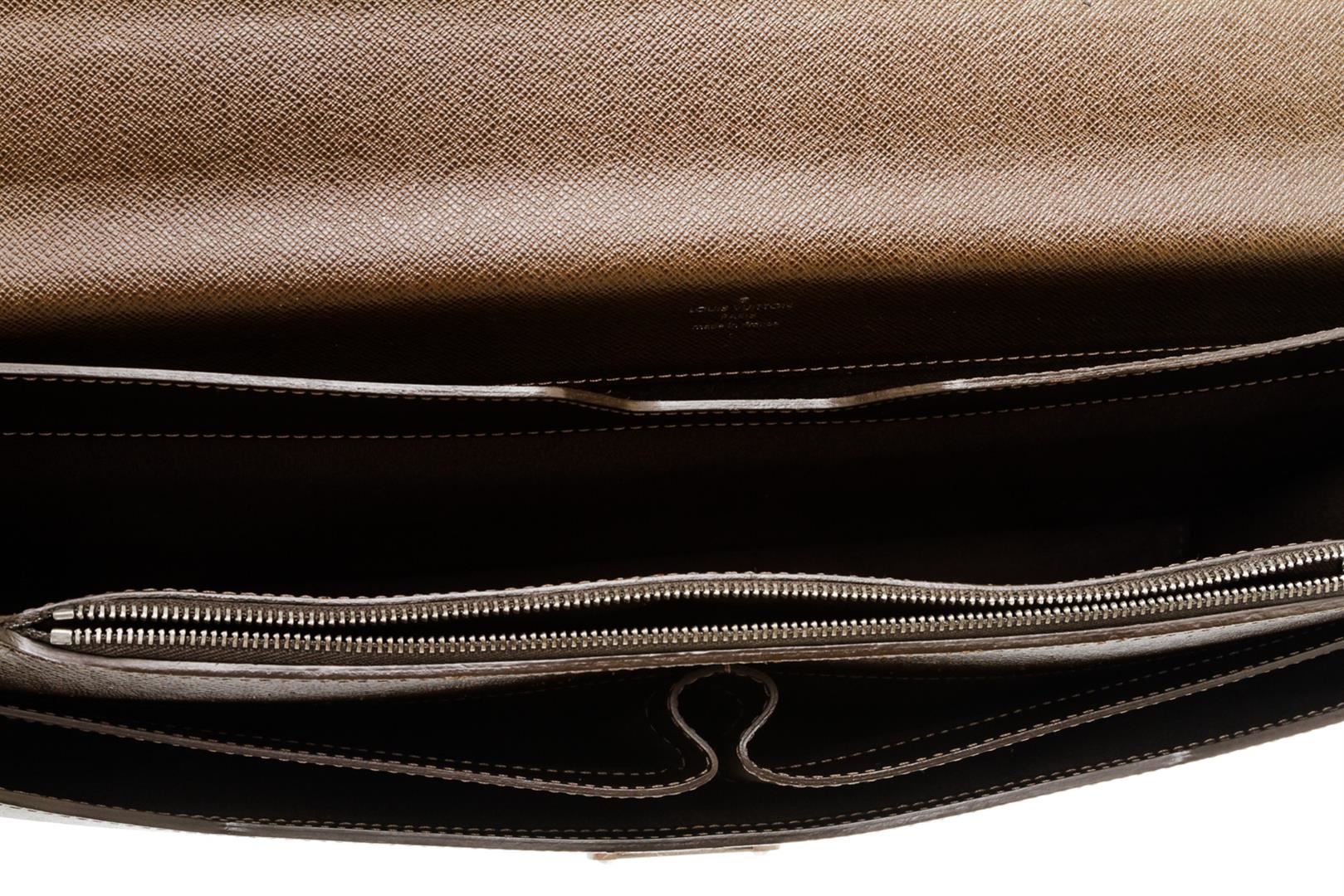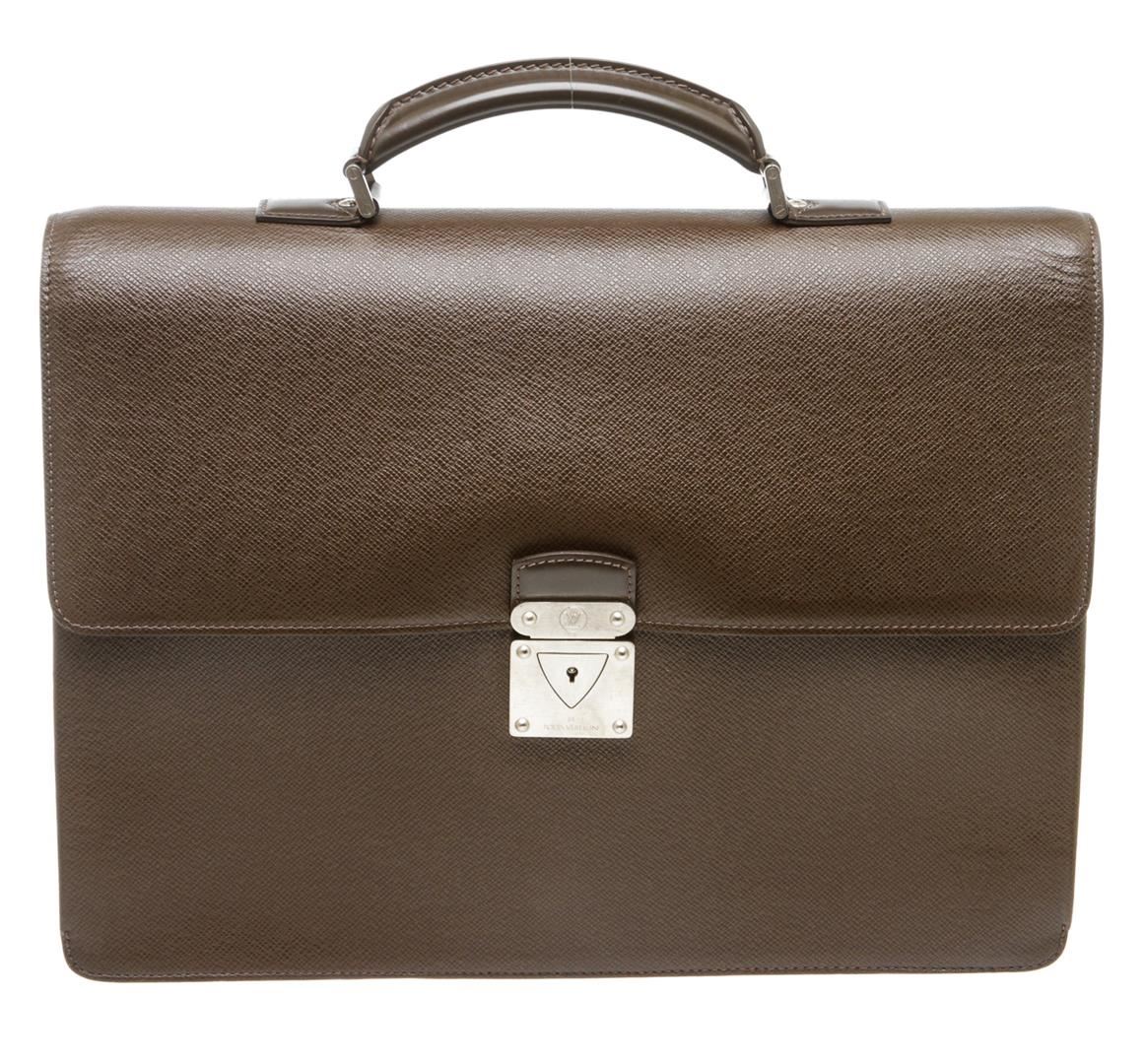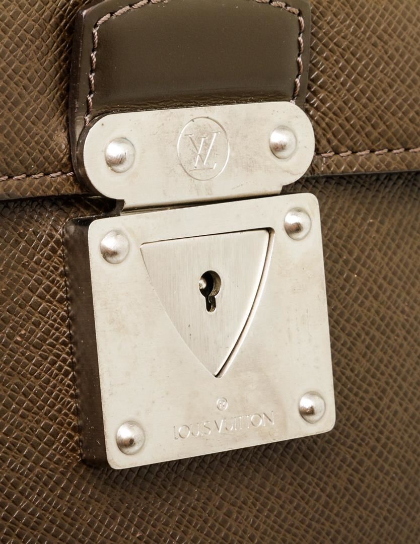 Brown Taiga leather Louis Vuitton Robusto briefcase with silver-tone hardware, slit pocket at back wall, canvas and leather interior lining, two interior compartments, three interior slit pockets, interior zip pocket and front security push-clasp closure.