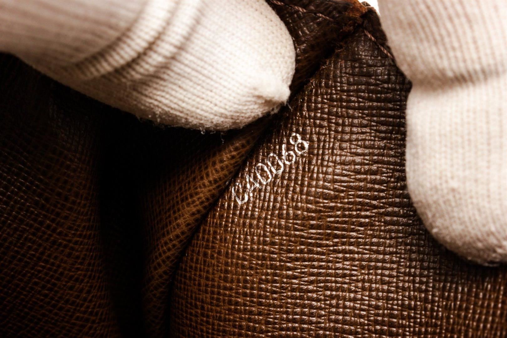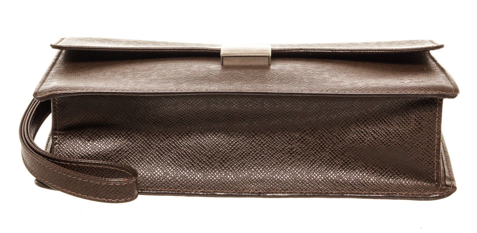 Louis Vuitton Brown Taiga Leather Selenga Pouch Bag with silver-tone hardware, single wristlet strap at side, single slit pocket at back, tonal leather lining, dual pockets at interior; one with zip closure and push-lock closure at front flap.