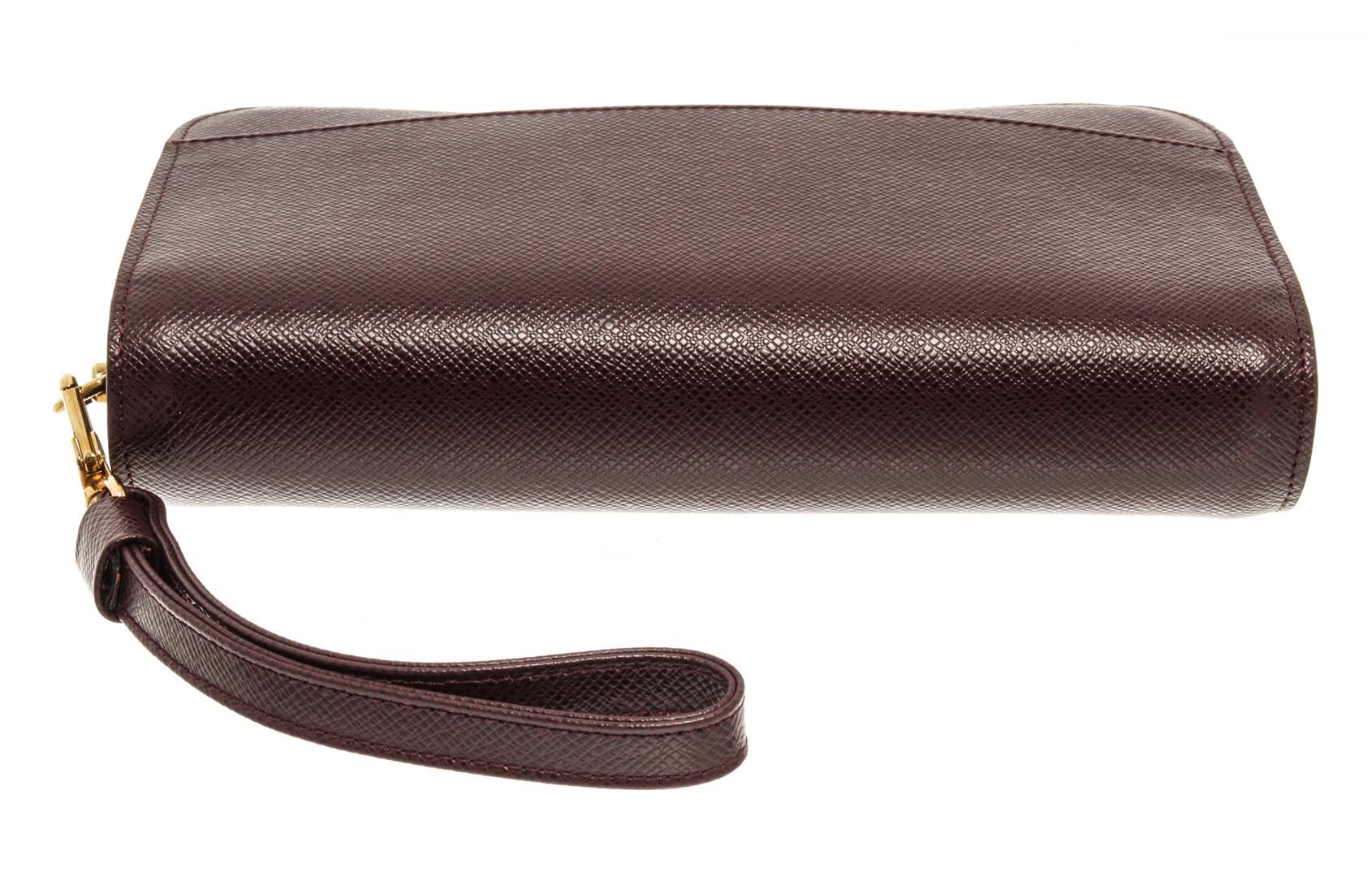 One Louis Vuitton Burgundy Taiga Leather Baikal Clutch. Item is sold AS-IS. All available information is listed in the description and shown in the photo. Louis Vuitton Red Leather Baikal Clutch with leather, gold-tone hardware, red leather trim, red taiga leather lining, three interior compartments pockets and a zipper closure.