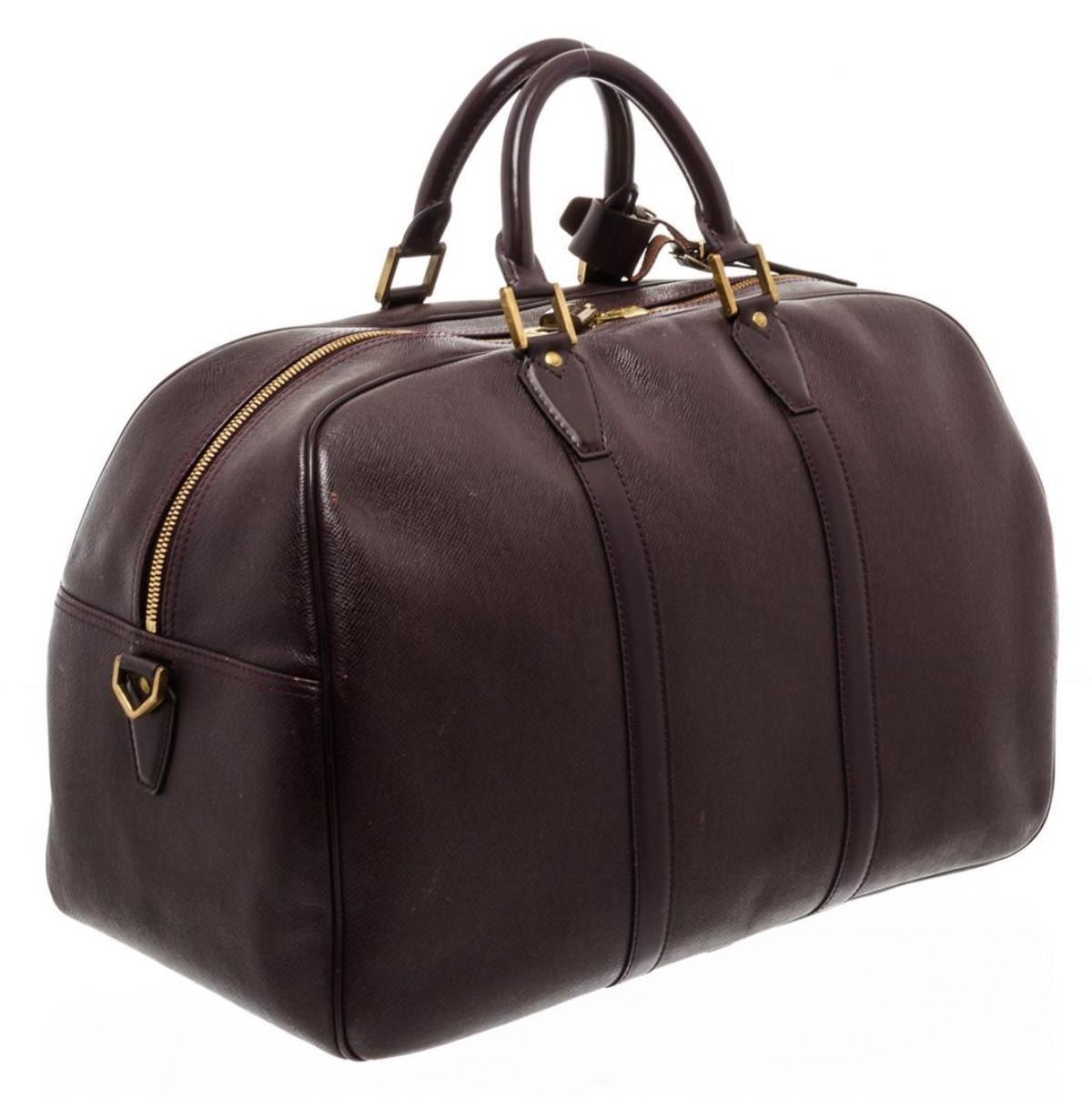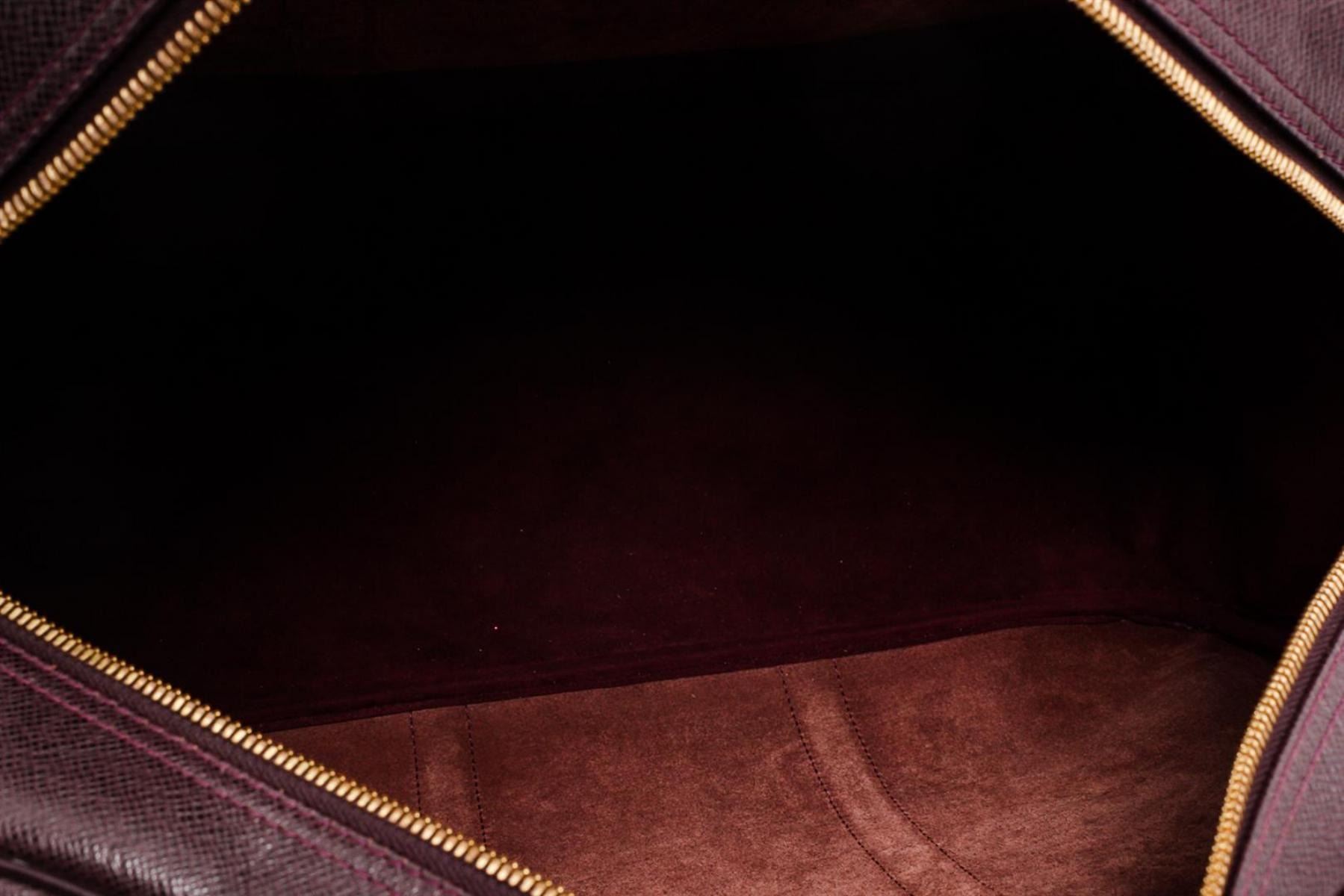 Burgundy Taiga leather Louis Vuitton Kendall travel bag with dual rolled top handles, brass hardware, tonal stitching throughout, Alcantara lining, single wall pocket, concealed garment back at bottom interior and zip-around closure at top. Authentic.