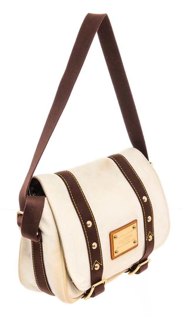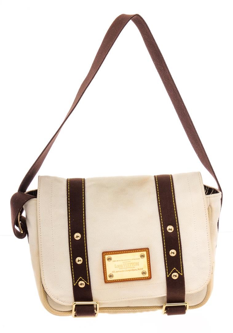 Cream canvas Louis Vuitton Antigua Besace Messenger bag with brass hardware, single adjustable flat shoulder strap, logo placard at front flap, dual slip pockets under front flap, brown and beige striped woven interior lining and dual buckle closures at front flap.