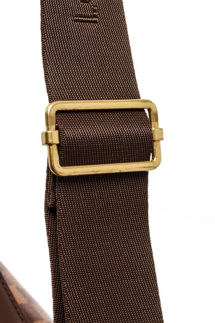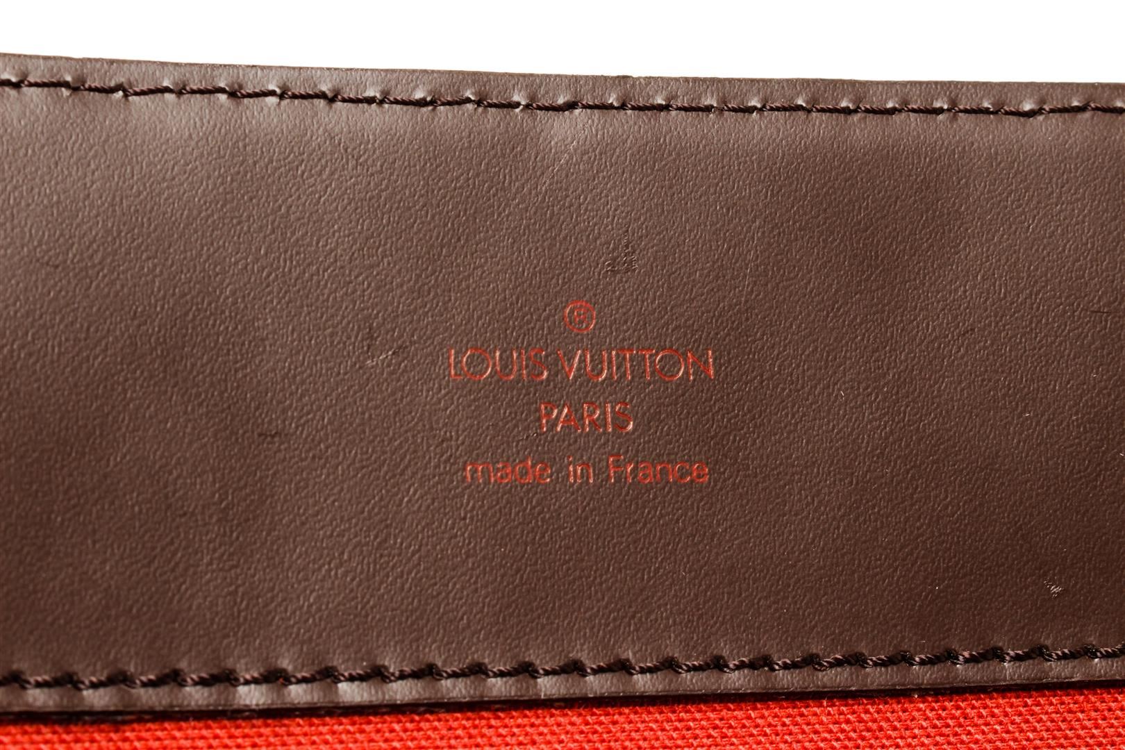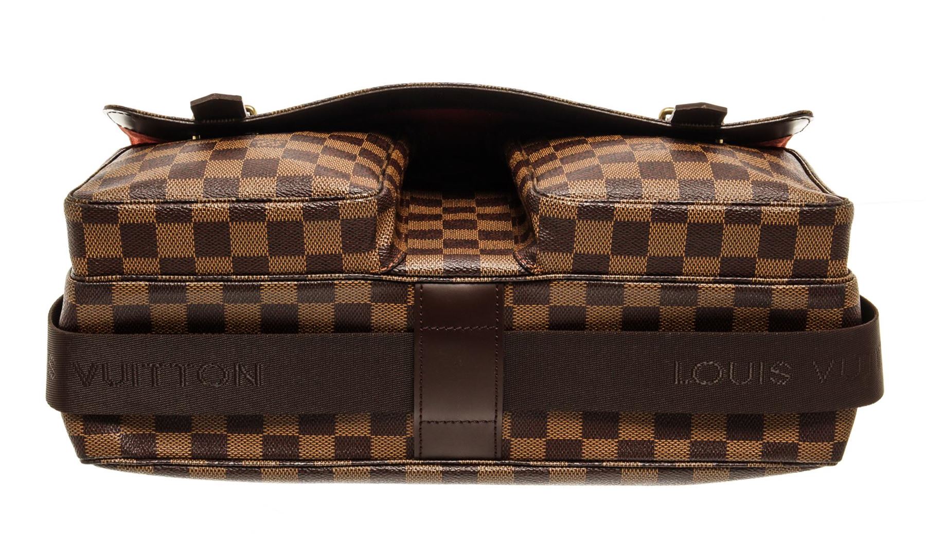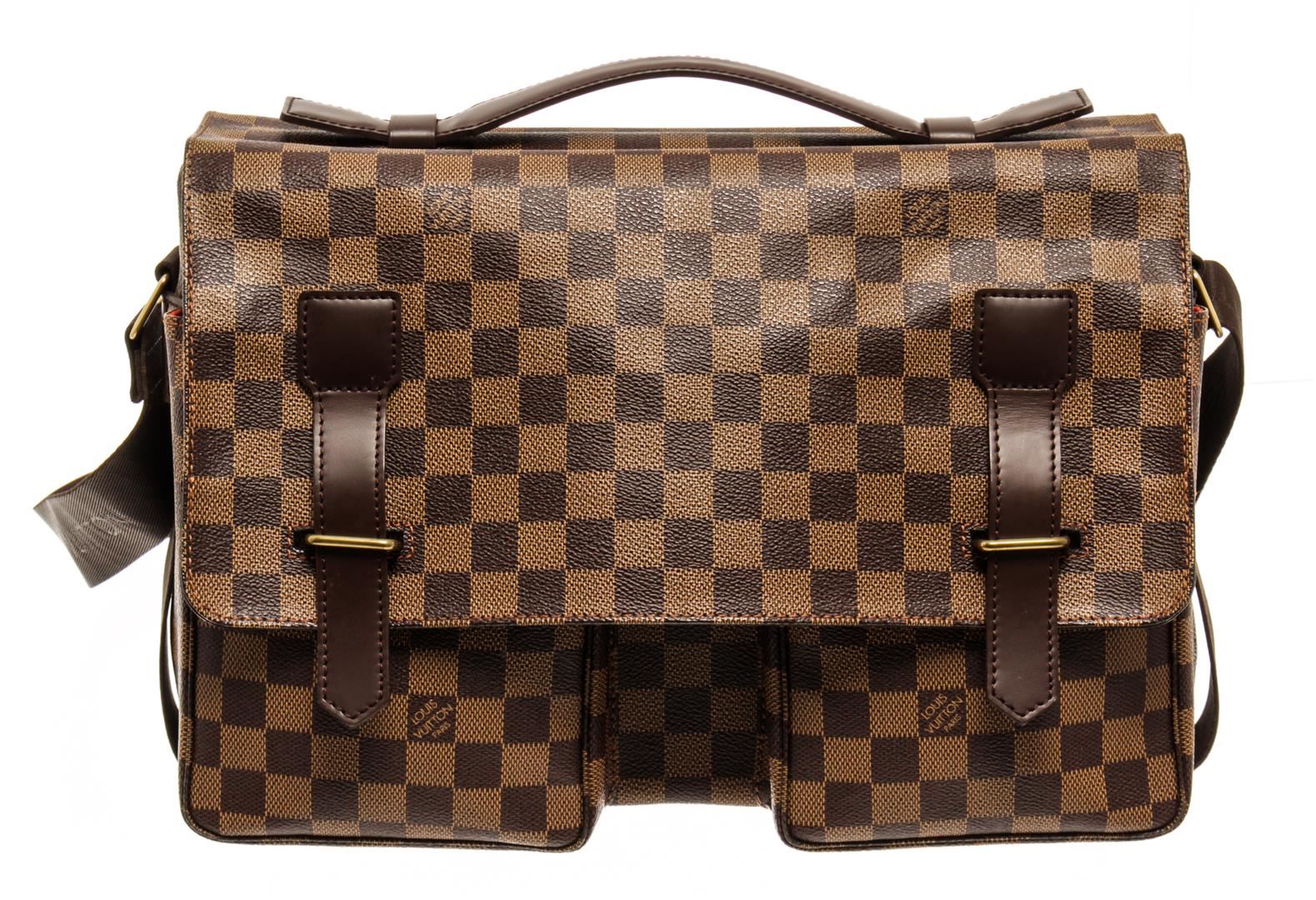 One Louis Vuitton Damier Ebene Broadway Crossbody Bag. Item is sold AS-IS. All available information is listed in the description and shown in the photo. Louis Vuitton Damier Ebene Broadway crossbody bag with top handle, adjustable fabric strap, red fabric lining, two interior slip pockets, two exterior pockets on the front side, gold-tone hardware, and flap and strap closure.