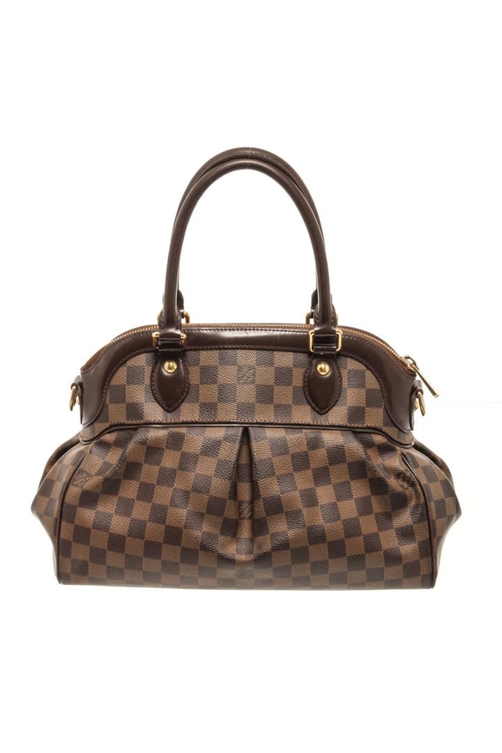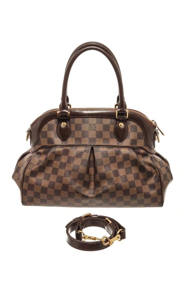 One Louis Vuitton Damier Ebene Canvas And Leather Trevi Pm Bag. Item is sold AS-IS. All available information is listed in the description and shown in the photo. louis vuitton damier ebene canvas and leather trevi pm bag with gold-tone hardware, protective metal feet, and a top zip that open. L:13.38", W:5.90", H:9.44" / Length:34 cm, Width:15 cm, Height:24 cm
