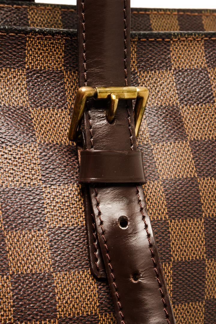 Louis Vuitton Damier Ebene Canvas Leather Chelsea Tote Bag. All available information is listed in the description and shown in the photos. Brown and tobacco Damier Ebene coated canvas Louis Vuitton Chelsea tote bag with gold-tone hardware, brown leather accents, dual flat shoulder straps, red canvas interior, single zip pocket at interior wall and zip closure at top. 16.5"x5.5"x10.5"xBag Drop:12.25"/41.9cmx13.9cmx26.6cmxBag Drop:31.1cm