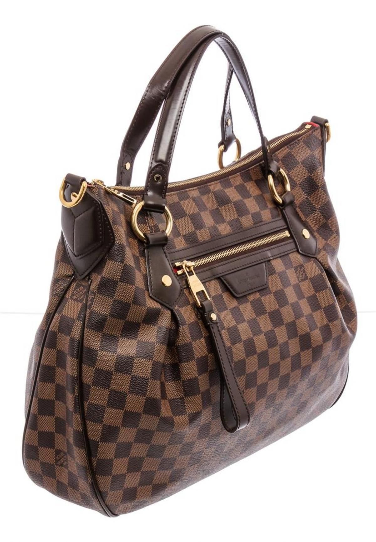 Brown and tobacco Damier Ebene coated canvas Louis Vuitton Evora MM with brass hardware, chocolate brown leather trim, single flat shoulder strap, dual flat top handles, single exterior zip pocket at front face, red Alcantara lining, dual slit pockets at interior wall and zip closure at top.