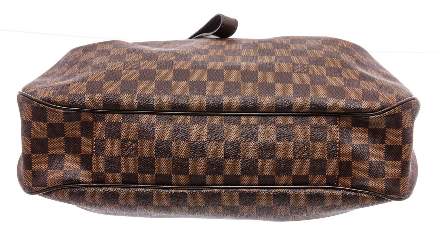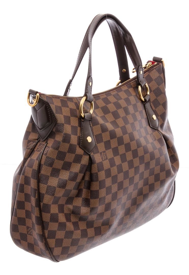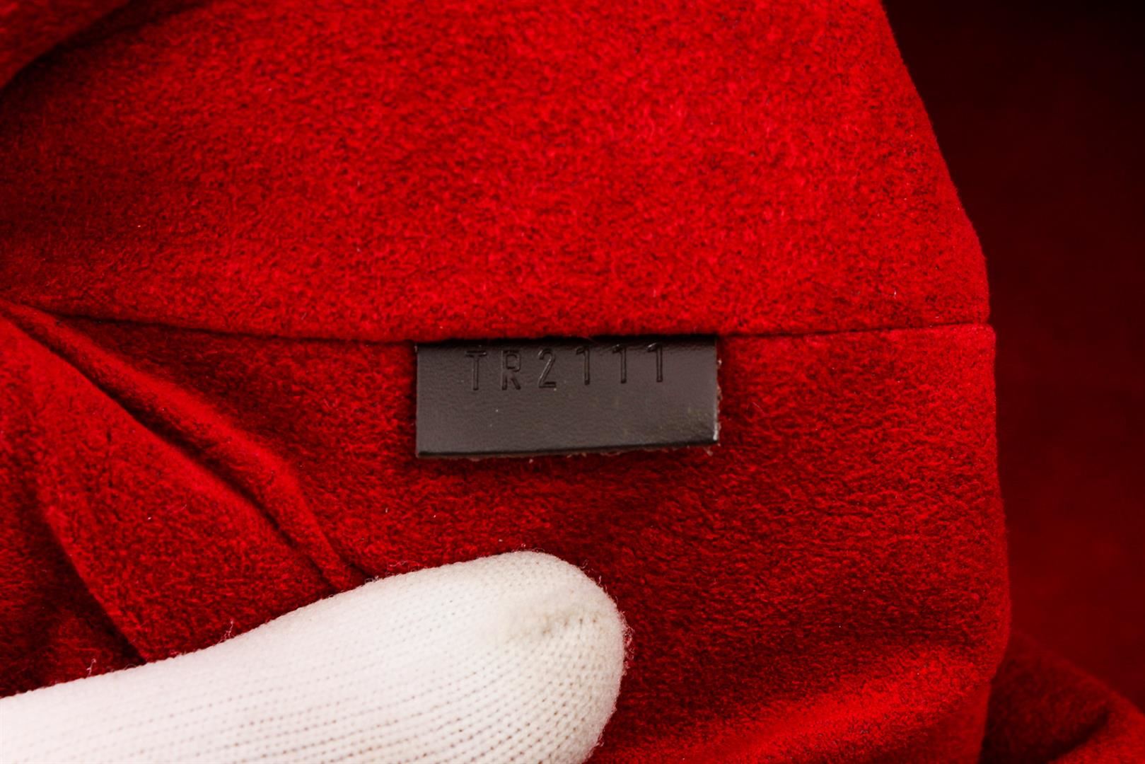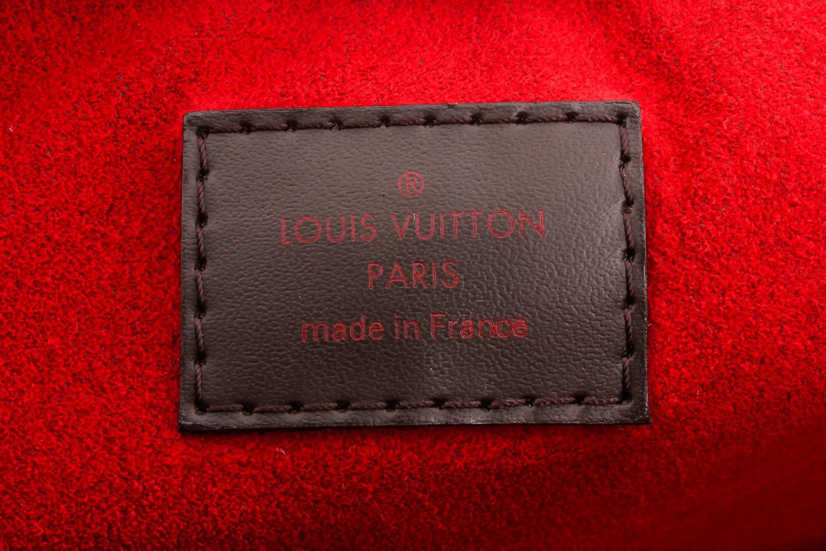 Brown and tobacco Damier Ebene coated canvas Louis Vuitton Evora MM with brass hardware, chocolate brown leather trim, single flat shoulder strap, dual flat top handles, single exterior zip pocket at front face, red Alcantara lining, dual slit pockets at interior wall and zip closure at top.