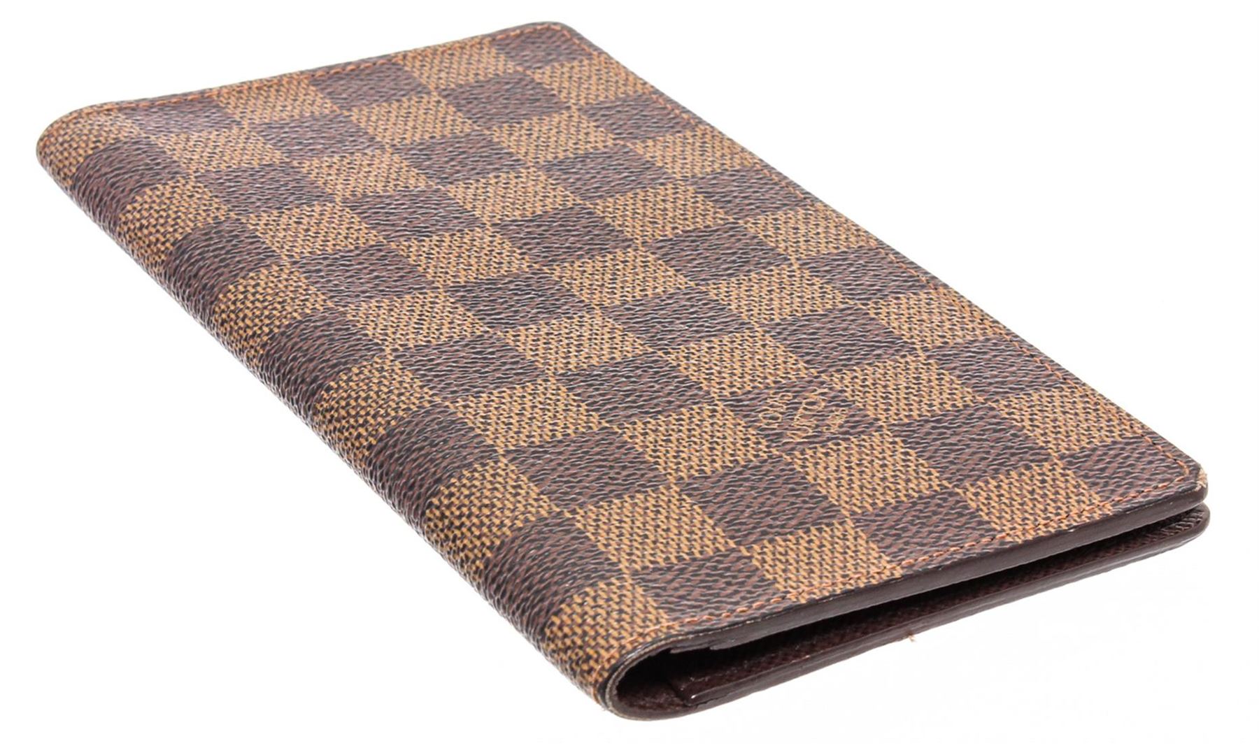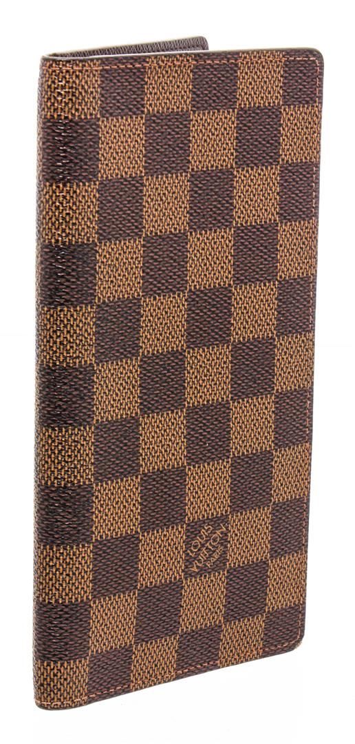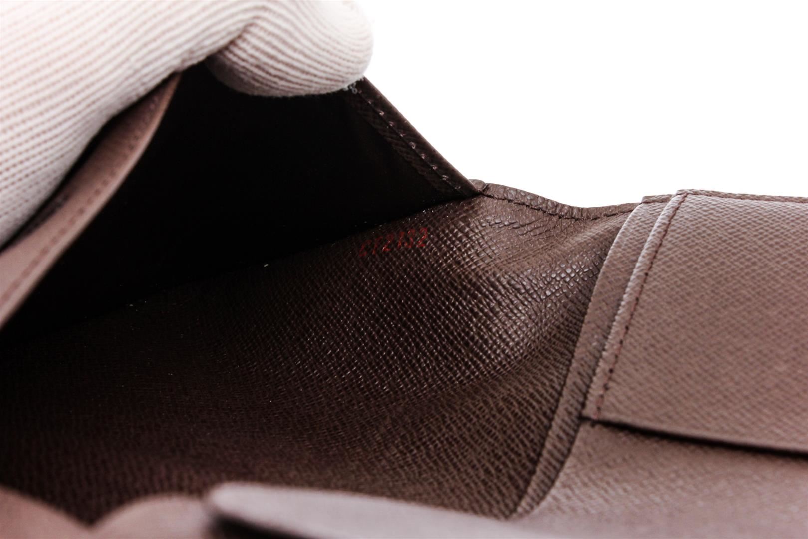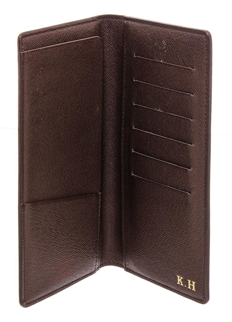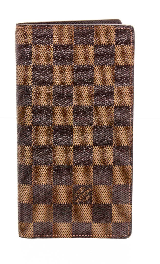 Chocolate and brown Damier Ebene coated canvas Louis Vuitton long wallet with tonal Taiga leather lining, dual interior slots, dual bill slots, five card slots and bifold closure.