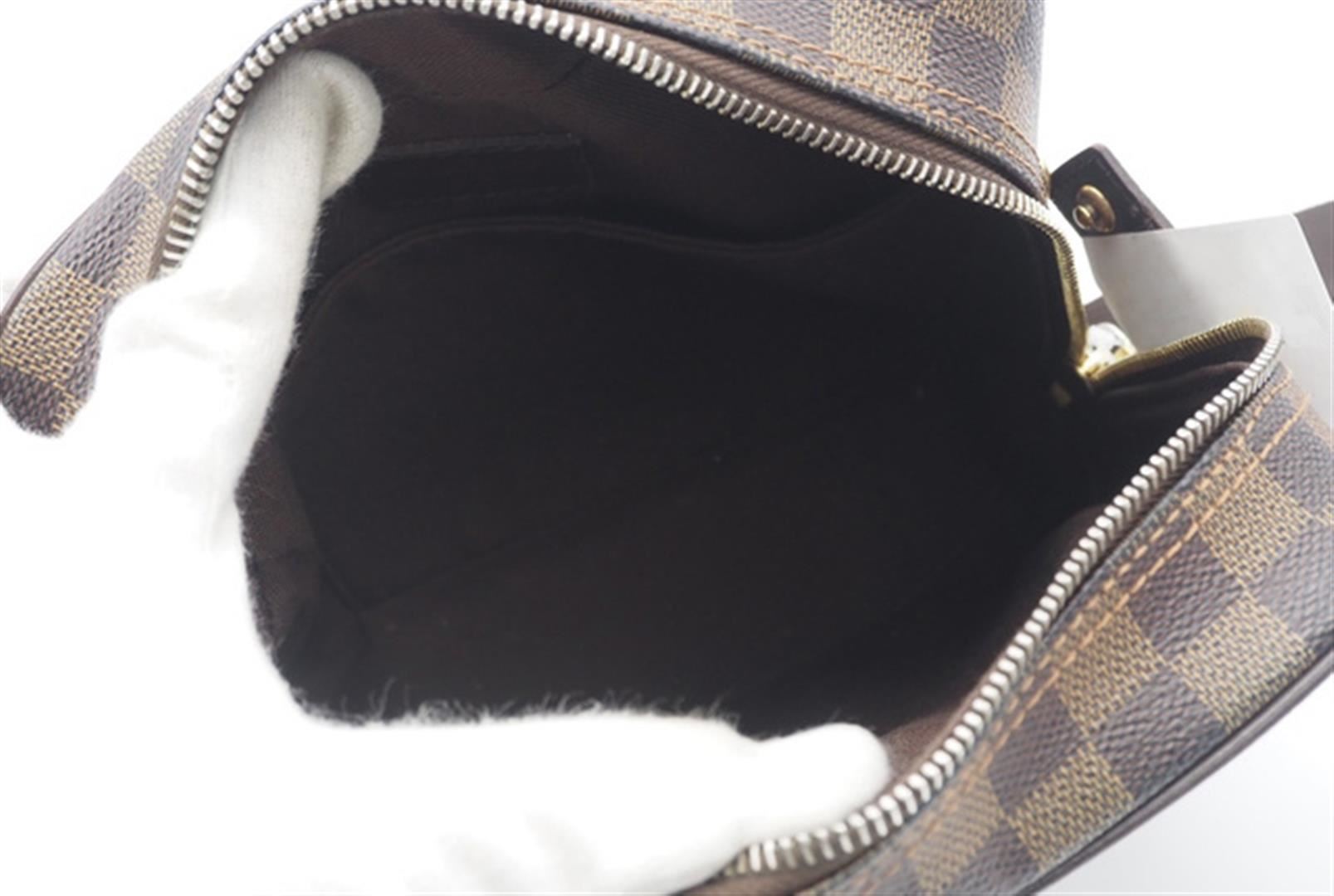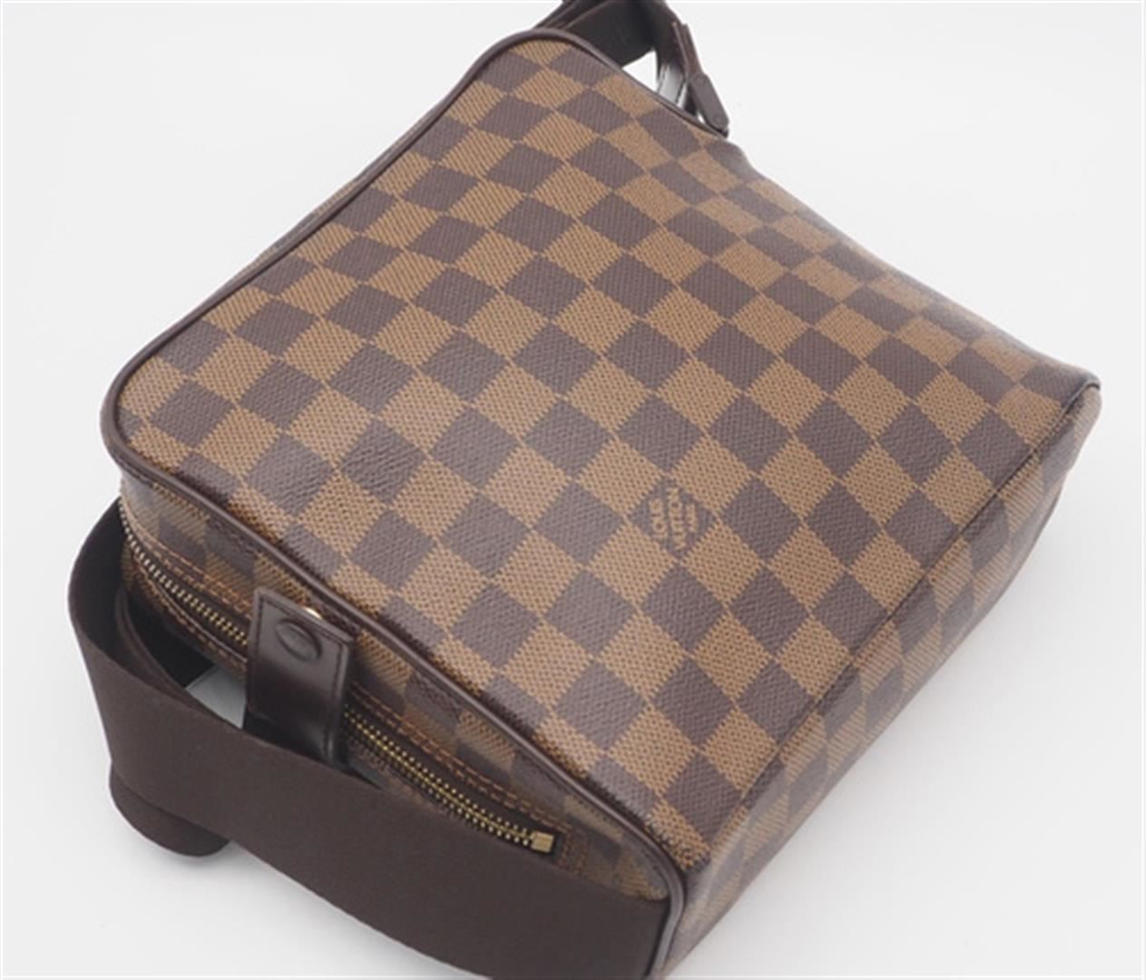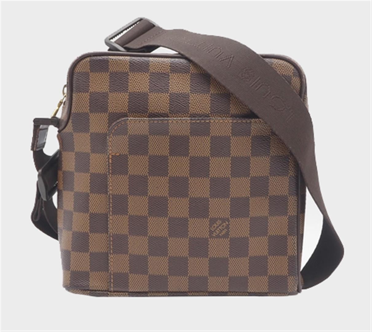 One Louis Vuitton Damier Ebene Canvas Leather Olav PM Crossbody Bag. Item is sold AS-IS. All available information is listed in the description and shown in the photo. Brown Damier Ebene coated canvas Louis Vuitton Olav PM with gold-tone hardware, brown leather trim, single flat shoulder strap, brown canvas interior, single exterior slit pocket at front, single slit pocket at interior wall and zip closure at top. 8" x 3.25" x 7.75"/20.3cm x 8.6cm x 19.7cm