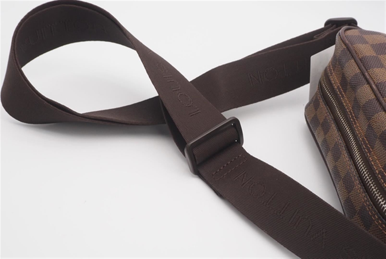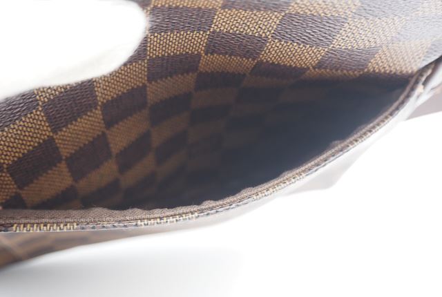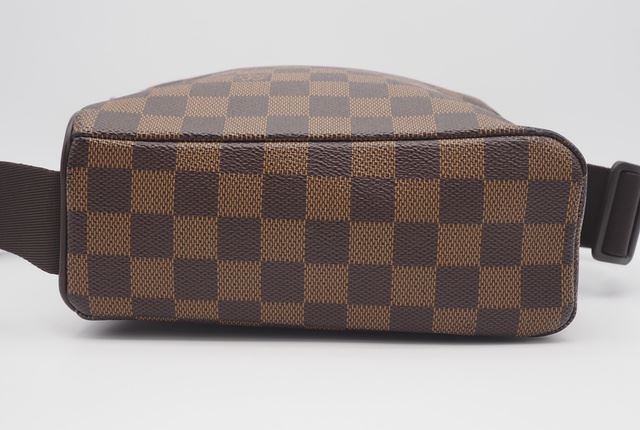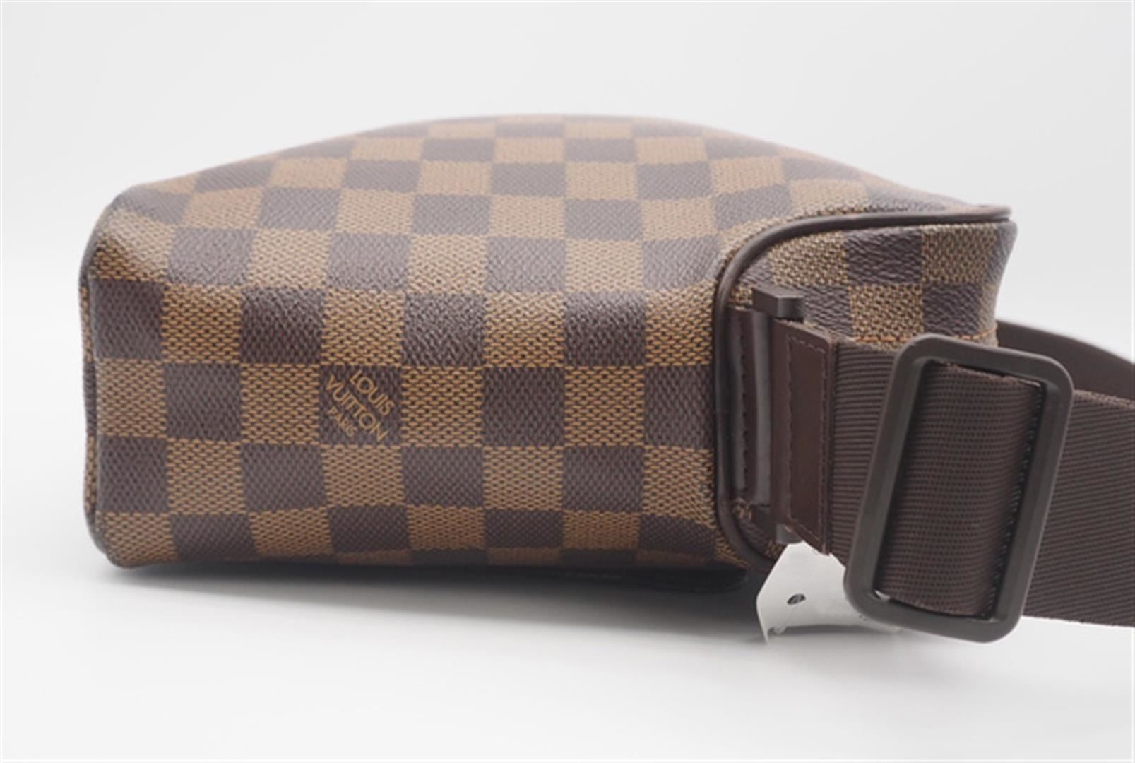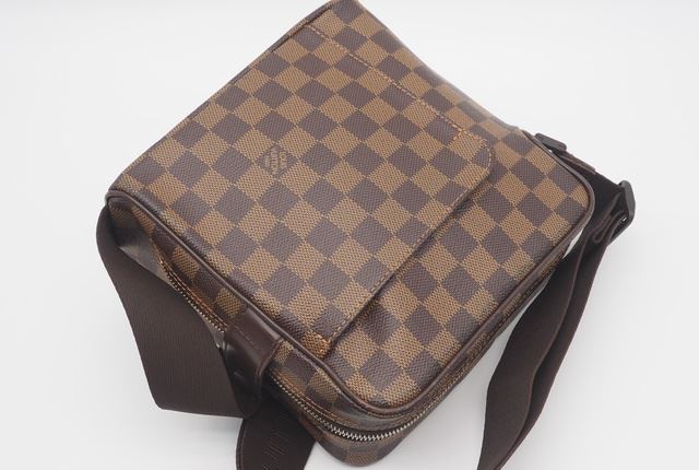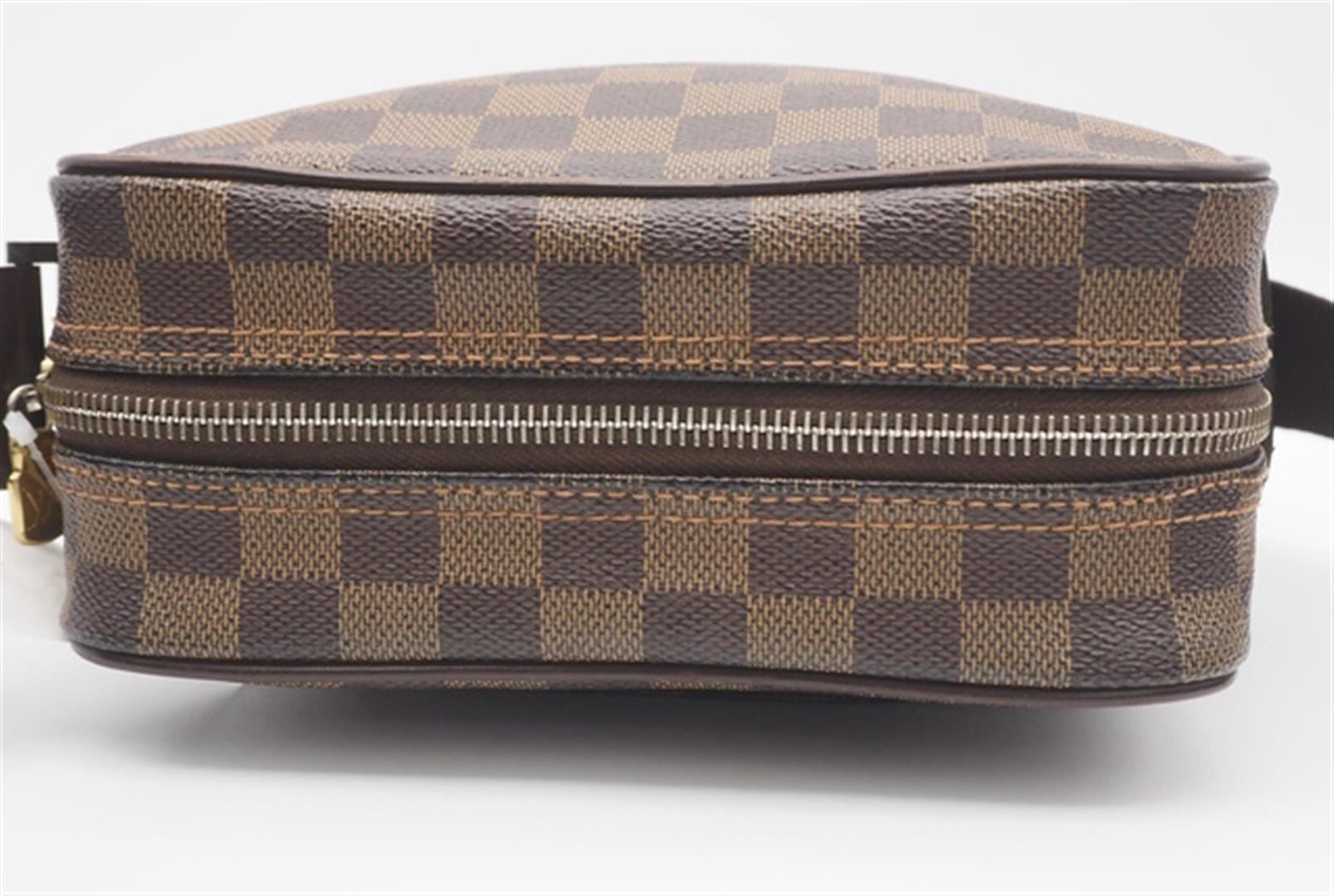 One Louis Vuitton Damier Ebene Canvas Leather Olav PM Crossbody Bag. Item is sold AS-IS. All available information is listed in the description and shown in the photo. Brown Damier Ebene coated canvas Louis Vuitton Olav PM with gold-tone hardware, brown leather trim, single flat shoulder strap, brown canvas interior, single exterior slit pocket at front, single slit pocket at interior wall and zip closure at top. 8" x 3.25" x 7.75"/20.3cm x 8.6cm x 19.7cm