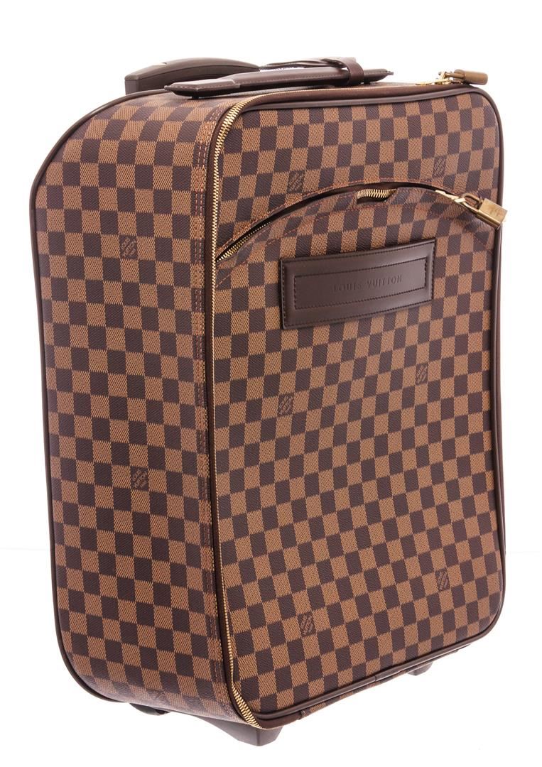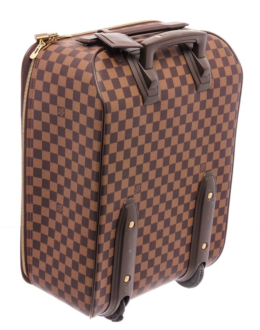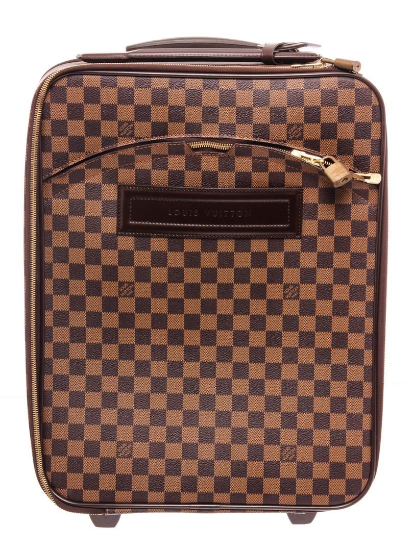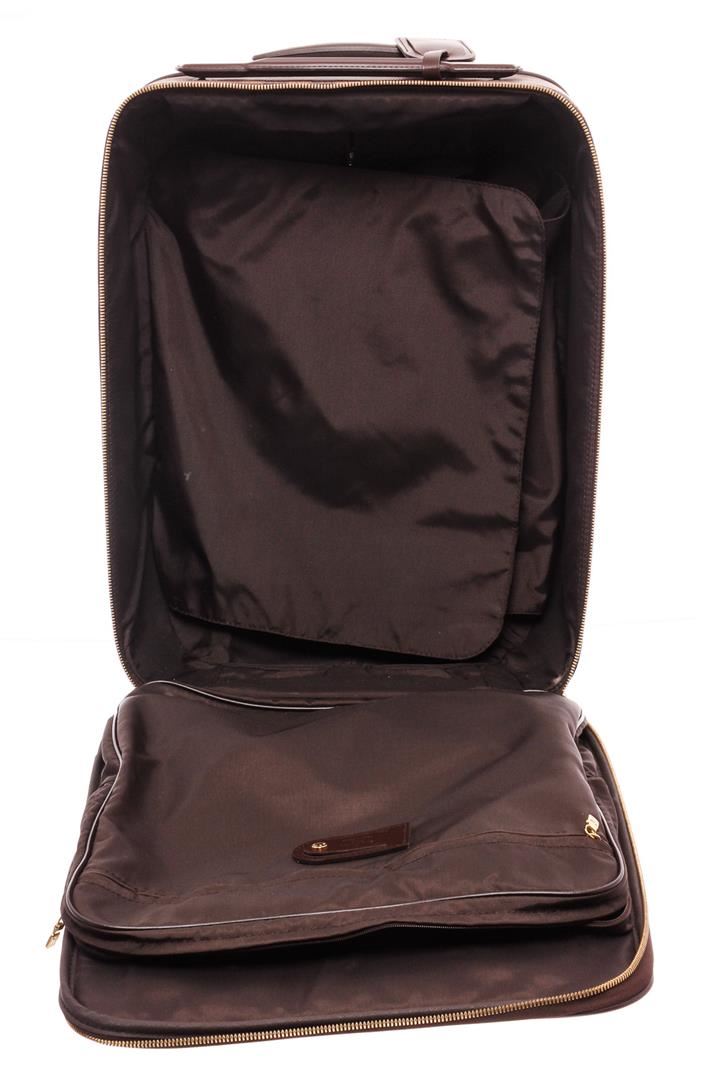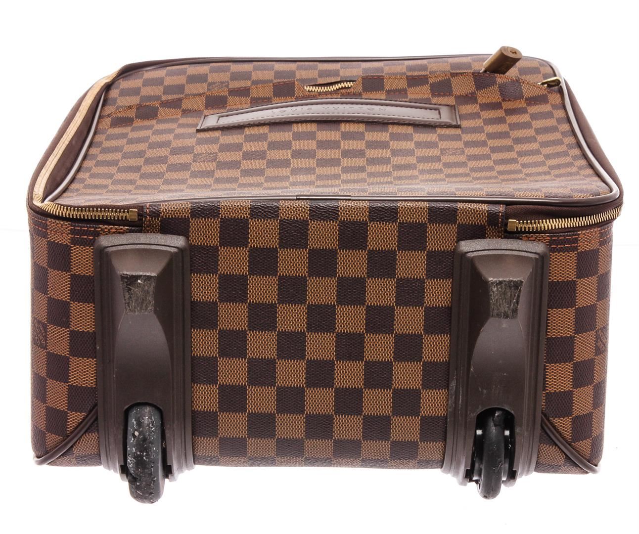 Brown and tan Damier Ebene coated canvas Louis Vuitton Pegase with brass hardware, tan vachetta leather trim, single pocket at exterior, dual flat handles at exterior, single telescopic handle, brown canvas lining, single zip pocket and two-way all around zip closure.