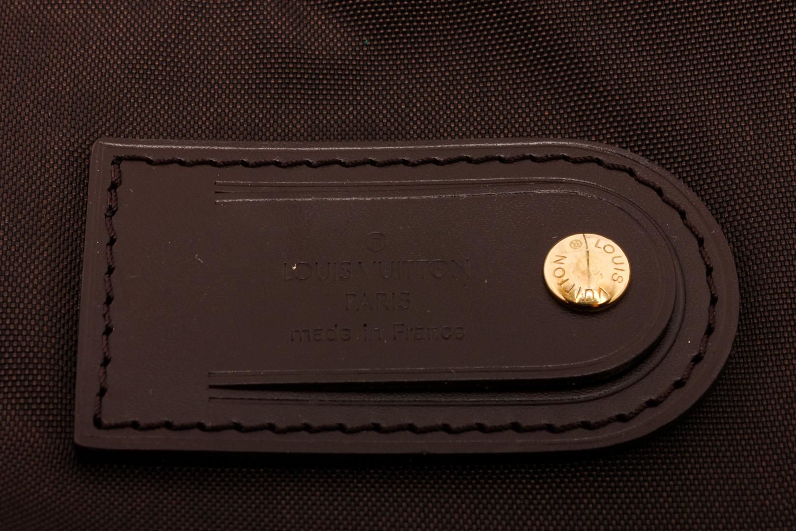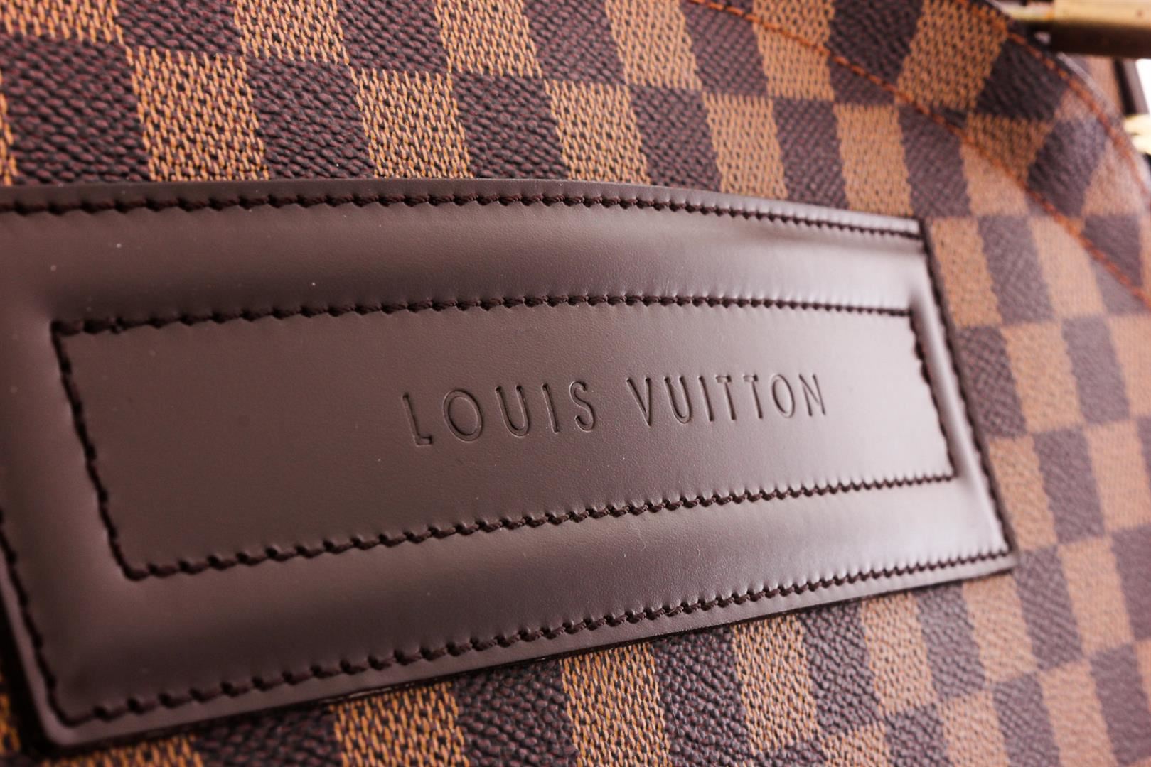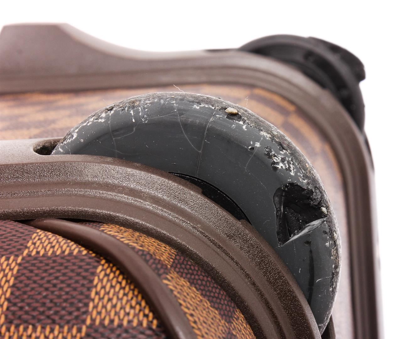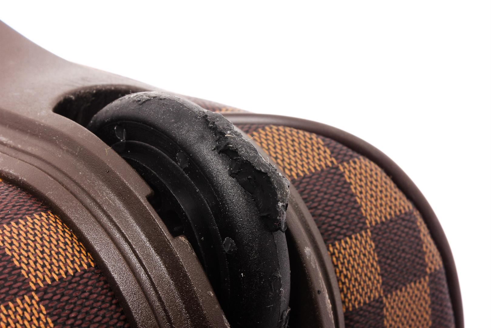 Brown and tan Damier Ebene coated canvas Louis Vuitton Pegase with brass hardware, tan vachetta leather trim, single pocket at exterior, dual flat handles at exterior, single telescopic handle, brown canvas lining, single zip pocket and two-way all around zip closure.