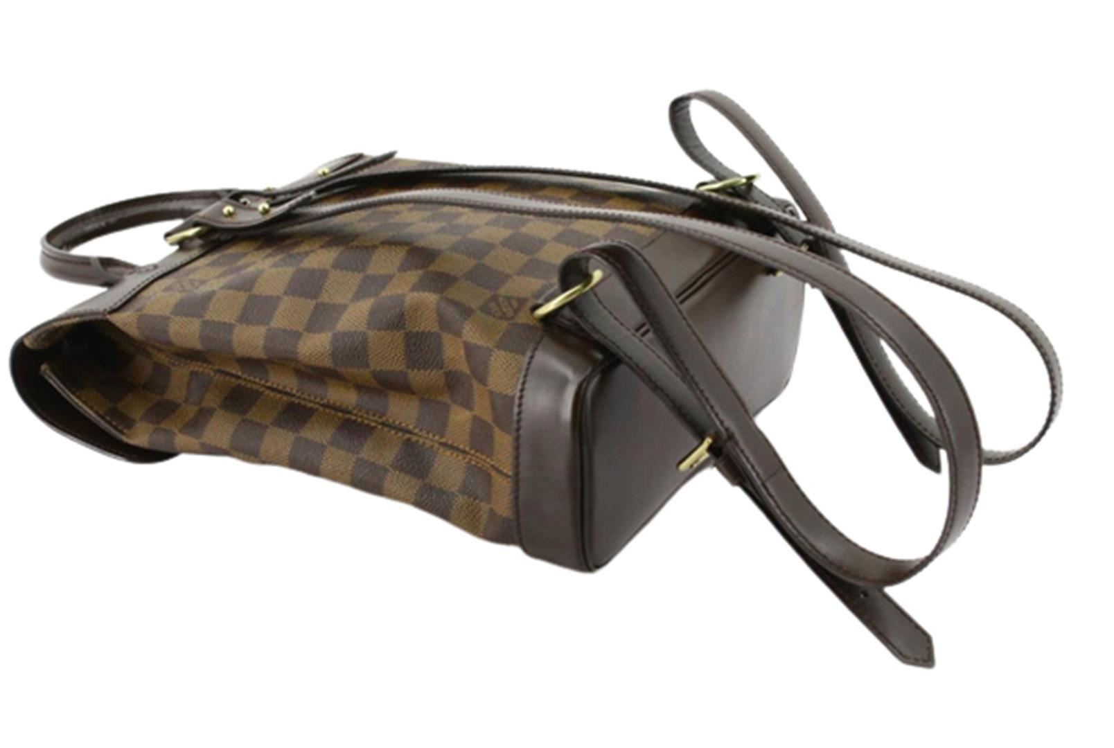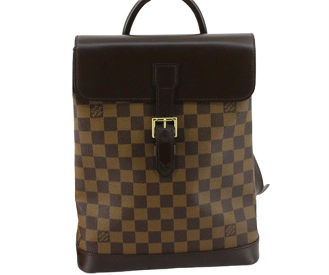 Louis Vuitton Damier Ebene Canvas Leather Soho Backpack. All available information is listed in the description and shown in the photos. Brown Damier Ebene coated canvas Louis Vuitton Soho backpack with gold-tone hardware, dark brown Vachetta leather trim, interior slip pockets, dual brown leather shoulder straps, one rolled top handle and flap closure on top with magnetic snap and buckle detail. 11.5" L x 4" W x 9.75" H