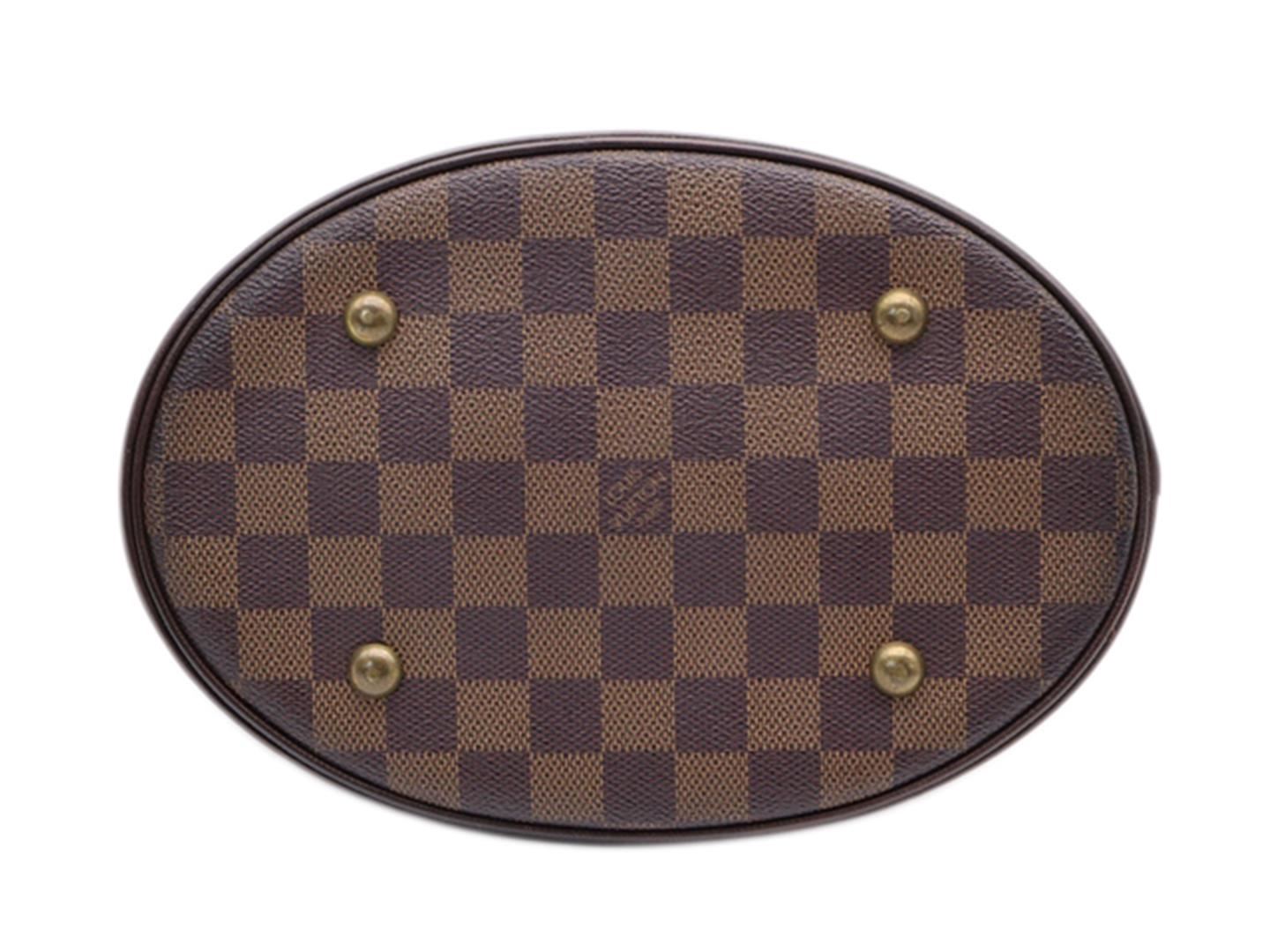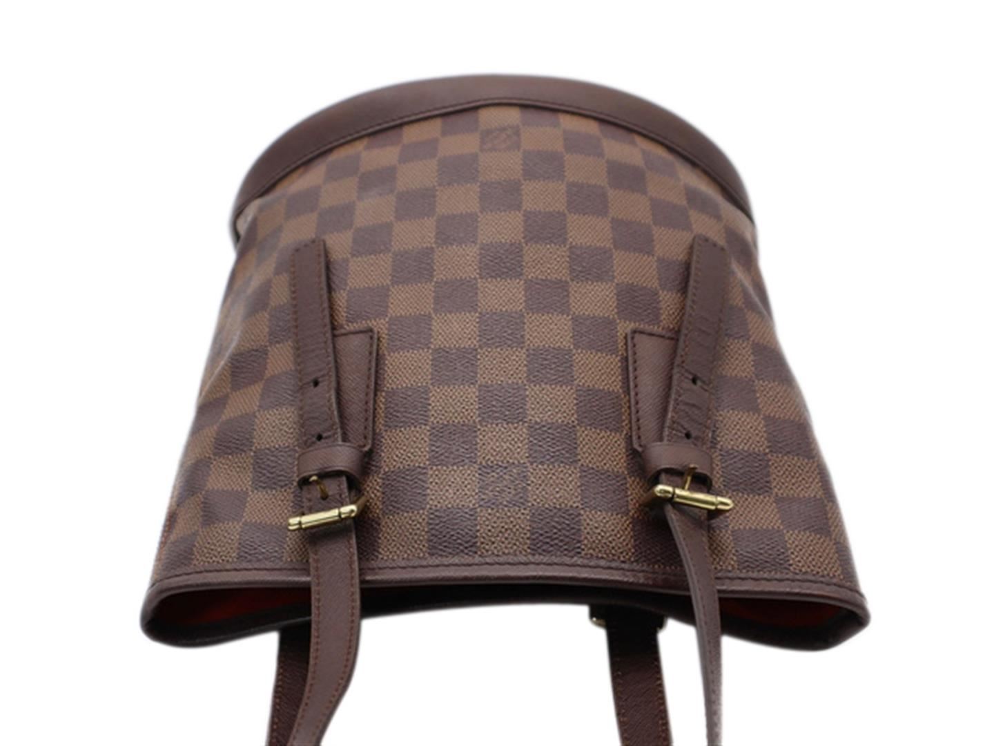 One Louis Vuitton Damier Ebene Marais Bucket Bag. Item is sold AS-IS. All available information is listed in the description and shown in the photo. Louis Vuitton Brown Damier Ebene coated canvas Marais Bucket Bag with gold tone hardware, brown taiga leather trim, red suede lining, zip interior pocket, brown leather dual top straps, and an open top closure
