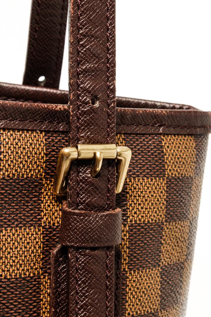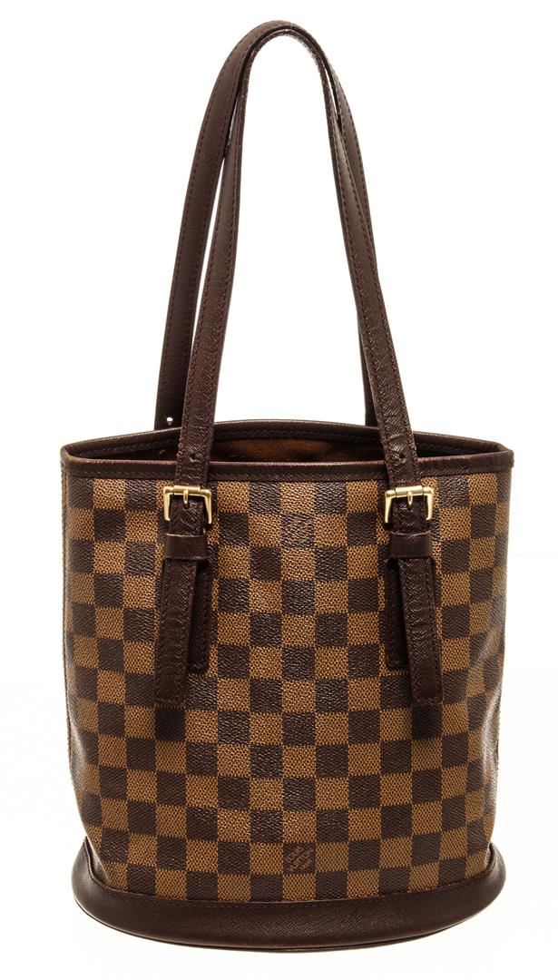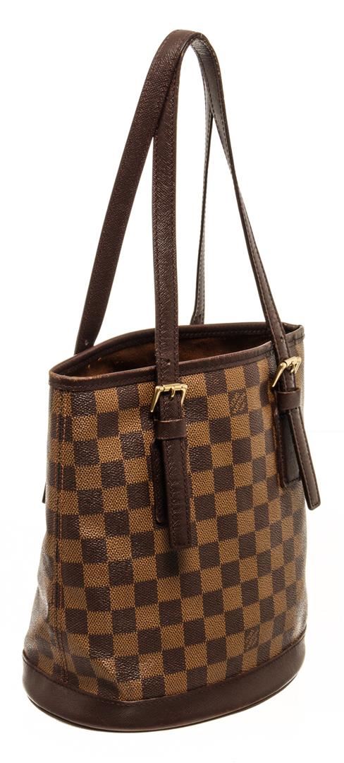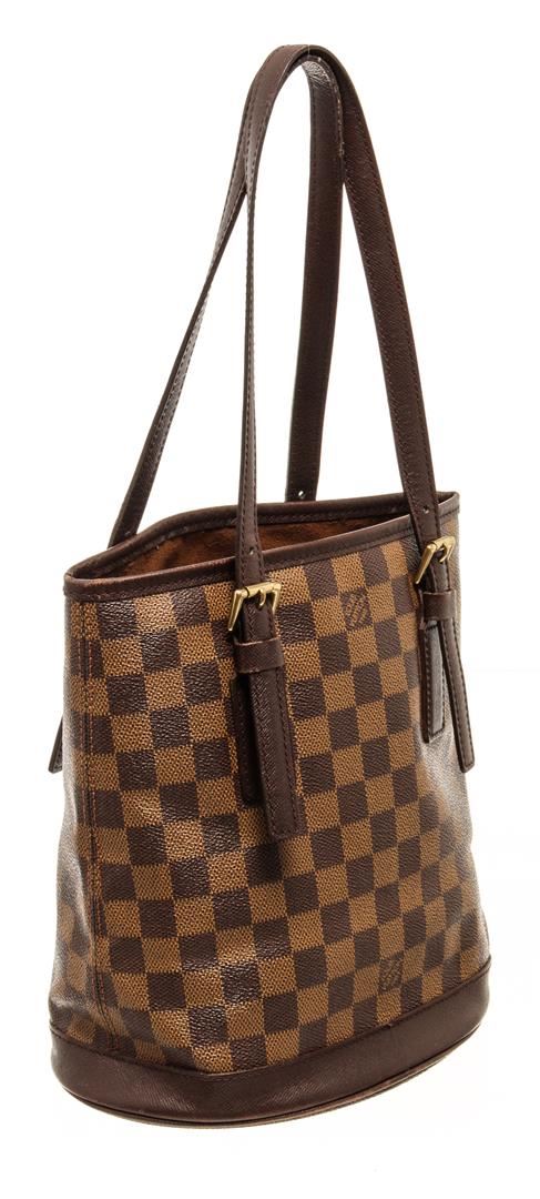 One Louis Vuitton Damier Ebene Marais Handbag. Item is sold AS-IS. All available information is listed in the description and shown in the photo. Louis Vuitton Damier Ebene Marais handbag with coated canvas exterior, brown suede lining, brown leather adjustable top handles, gold-tone hardware, open top, and one main compartment with one zip pocket.