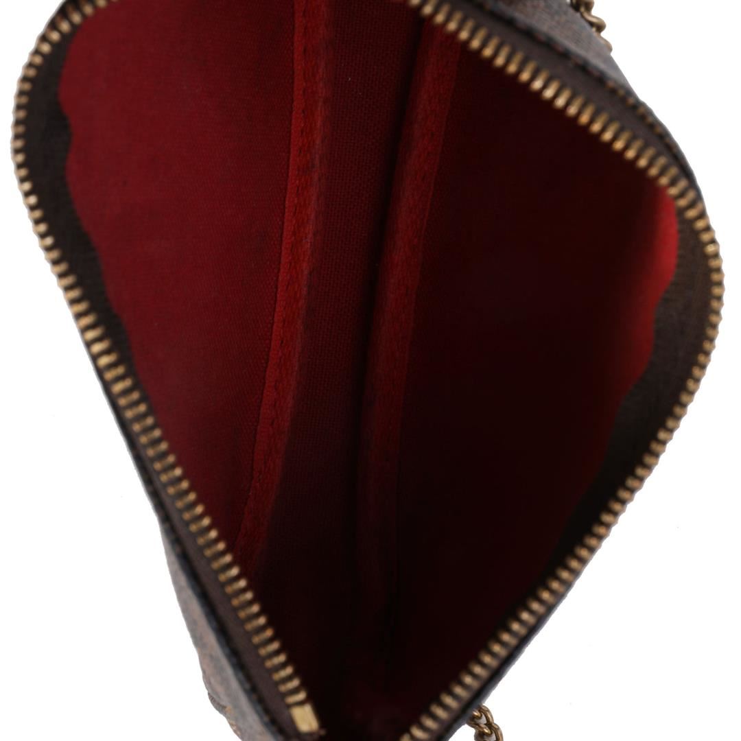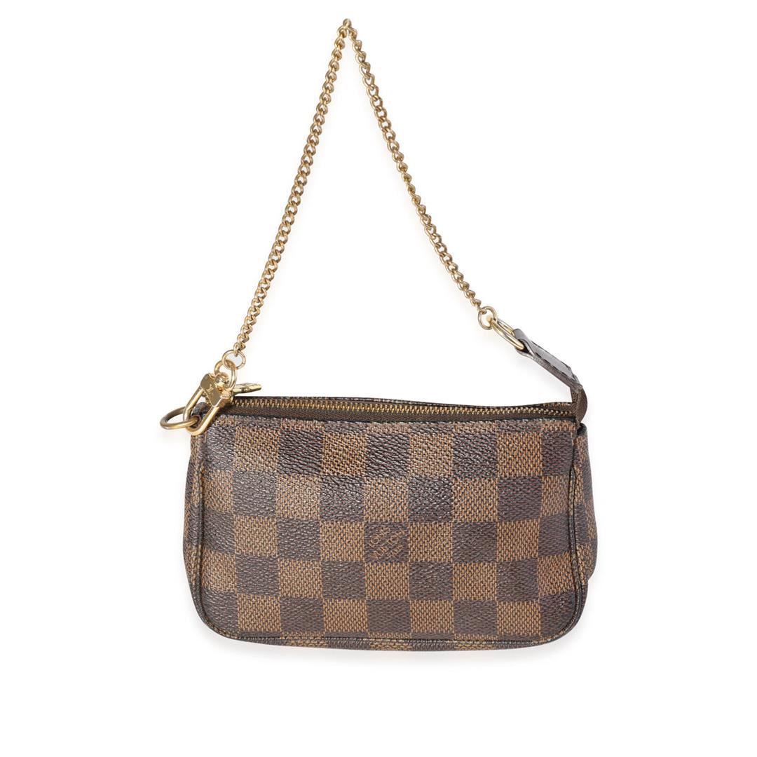 One Louis Vuitton Damier Ebene Mini Pochette Accessoires. Item is sold AS-IS. All available information is listed in the description and shown in the photo. Louis Vuitton Damier Ebene Mini Pochette Accessoires. Features gold hardware, red suede interior, and a gold zipper closure.