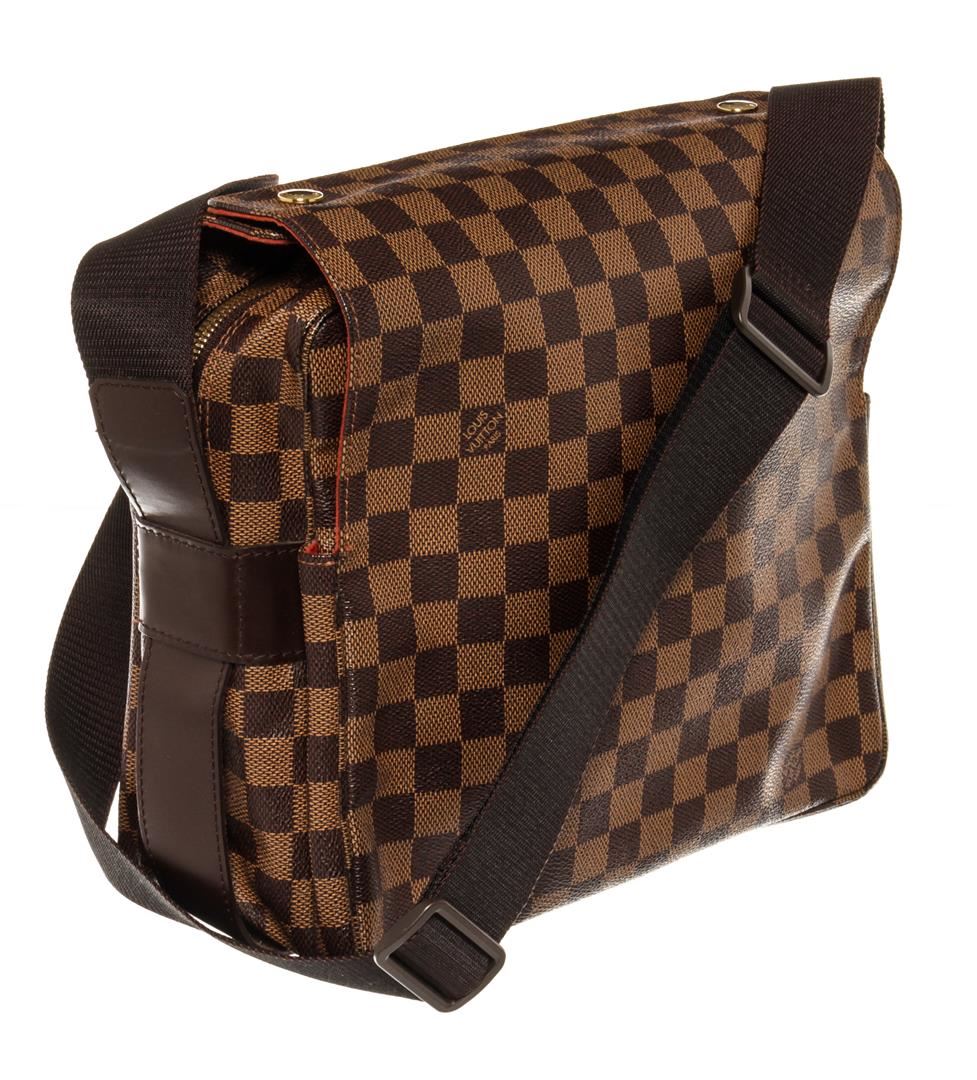 One Louis Vuitton Damier Ebene Naviglio Messenger Bag. Item is sold AS-IS. All available information is listed in the description and shown in the photo. Louis Vuitton Damier Ebene Naviglio Messenger Bag with gold-tone hardware, brown leather trim, red fabric lining, nylon strap, and top snap closures with a central zipper.