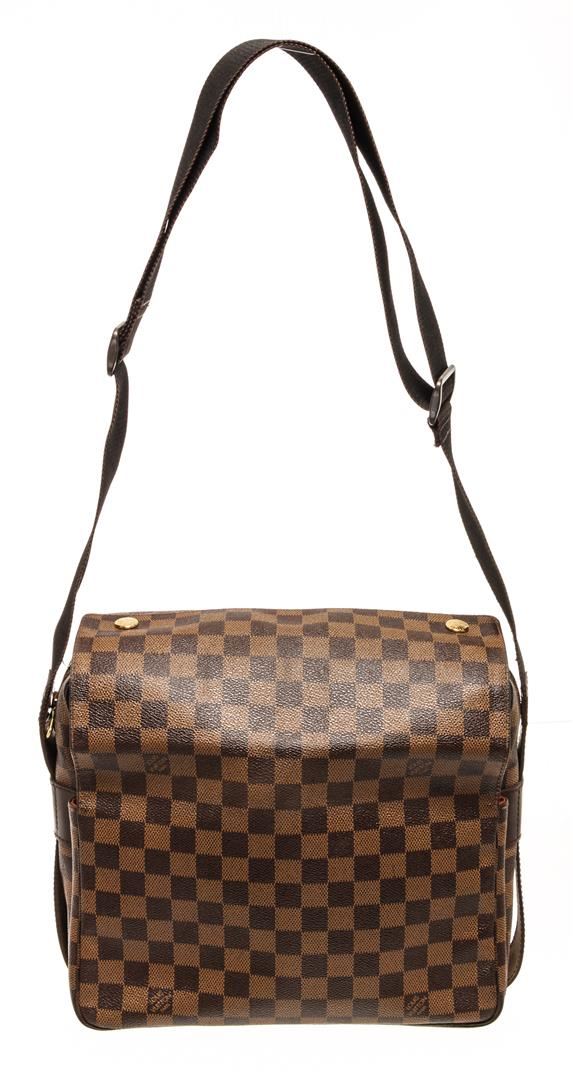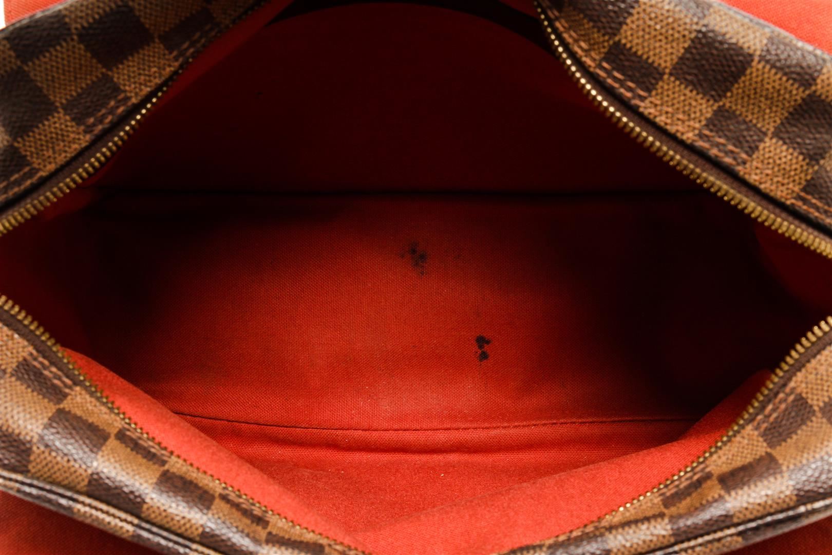 One Louis Vuitton Damier Ebene Naviglio. Item is sold AS-IS. All available information is listed in the description and shown in the photo. Louis Vuitton Damier Ebene Naviglio shoulder bag with adjustable strap, flap and zip closure, red fabric lining, one interior slip pocket, and gold-tone hardware.
