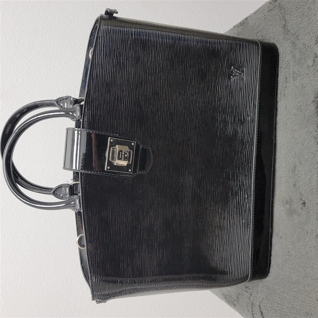 One Louis Vuitton Electric Epi Mirabeau Tote Bag w/ Alcantara Lining. This sleek tote is crafted of fine high gloss textured epi leather in black. The bag features rolled leather top handles, an optional, adjustable shoulder strap, and a polished silver turn-lock. This opens the crossover strap to reveal a grey microfiber interior with zipper and patch pockets. Great condition, smoke free.