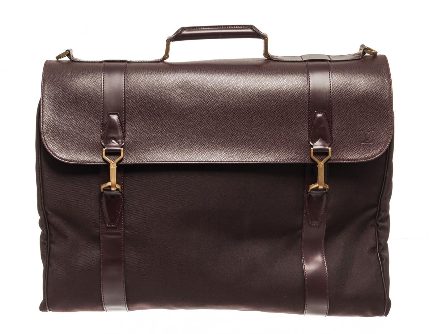 Louis Vuitton Garment Travel Bag Maroon Taiga Leather. Brand: Louis Vuitton, Style: Garment, Type: Travel Bag, Exterior Color: Maroon Taiga, Exterior Material: Leather, Exterior Pockets: One Zip, Interior Color: Maroon, Interior Material: Nylon, Interior Pockets: Two Zip, Two slip,, Closure: Hook, Handle/Strap Type: Top Handle, Length: 16.5, Width: 4, Height: 13, Handle Drop: 5. Condition: Leather is worn. Item is sold AS-IS and all information pertaining to this lot is available in the photos or this description.