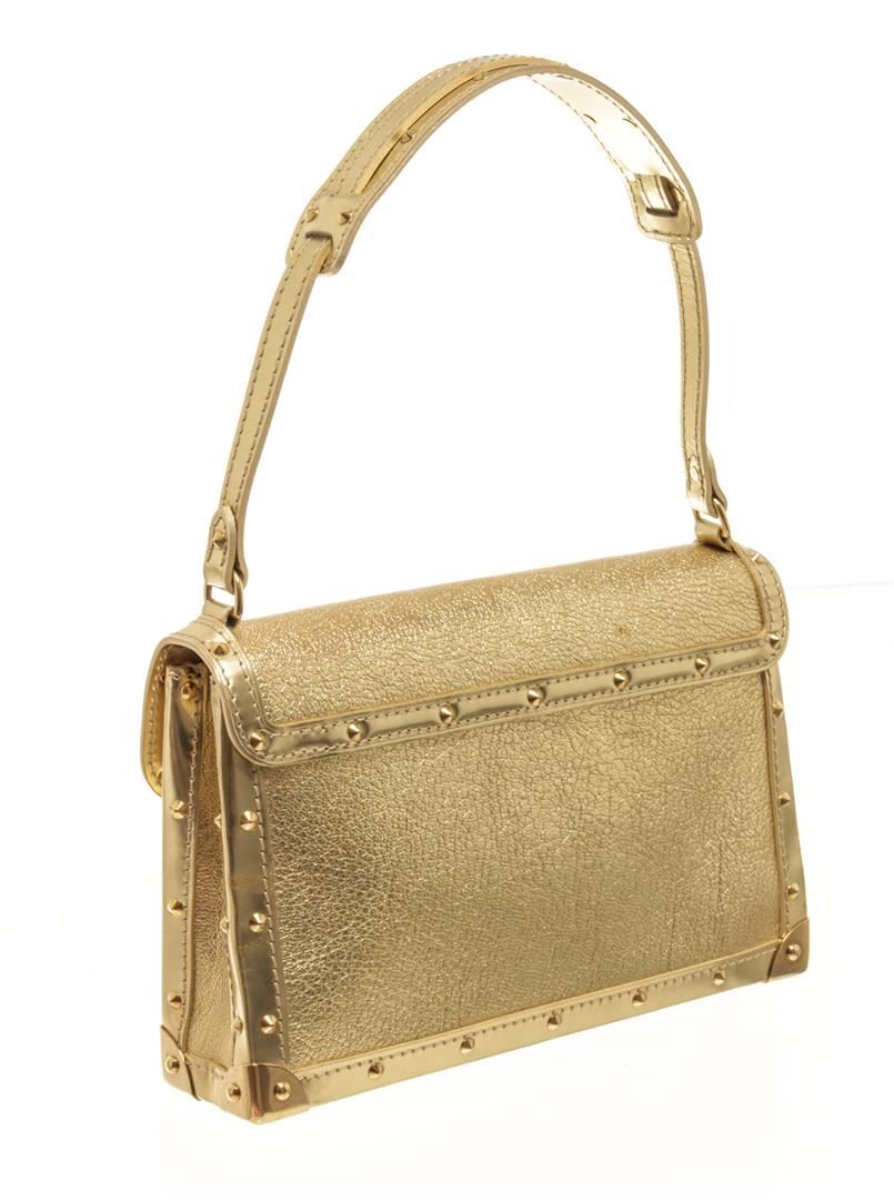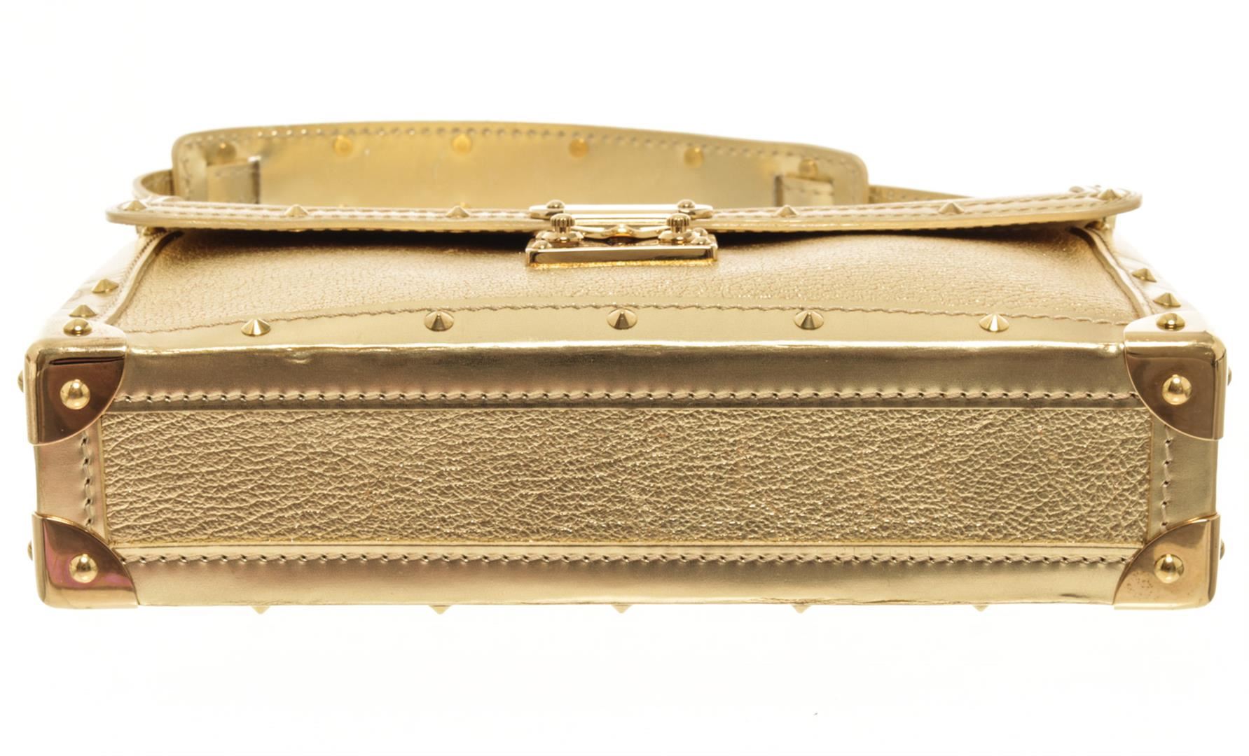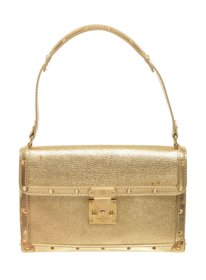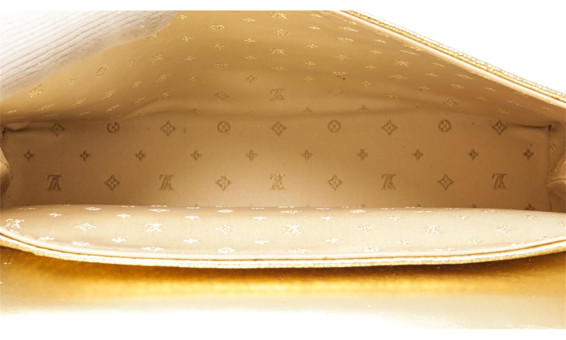 One Louis Vuitton Gold Leather Top Handle Bag. Item is sold AS-IS. All available information is listed in the description and shown in the photo. Louis Vuitton Top Handle Bag with louis vuitton top handle bag with gold leather, gold-tone hardware, flat handle, logo jacquard lining, push-lock closure at front. There are some stains on the exterior leather. Handle Drop: 6", Height: 5.75", Width: 8.75", Depth: 2" / Handle Drop: 15.24, 14.6 x 22.2 x 5.08 CM