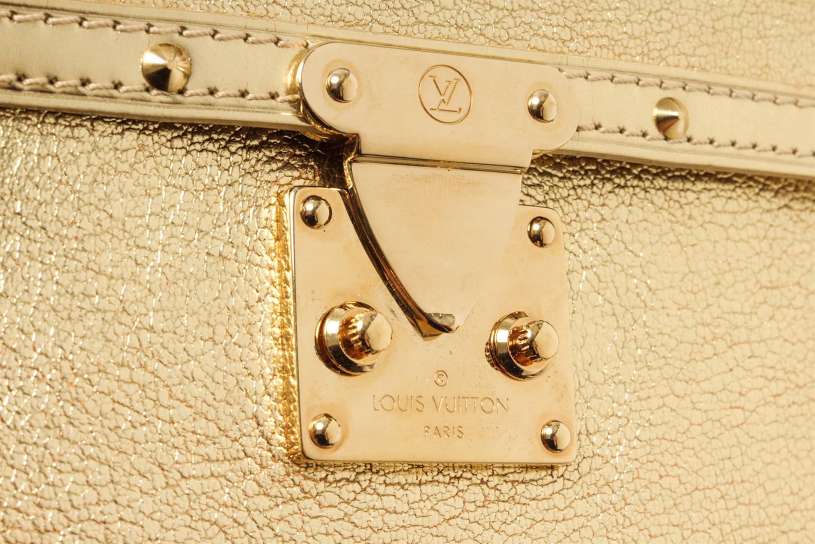 One Louis Vuitton Gold Leather Top Handle Bag. Item is sold AS-IS. All available information is listed in the description and shown in the photo. Louis Vuitton Top Handle Bag with louis vuitton top handle bag with gold leather, gold-tone hardware, flat handle, logo jacquard lining, push-lock closure at front. There are some stains on the exterior leather. Handle Drop: 6", Height: 5.75", Width: 8.75", Depth: 2" / Handle Drop: 15.24, 14.6 x 22.2 x 5.08 CM