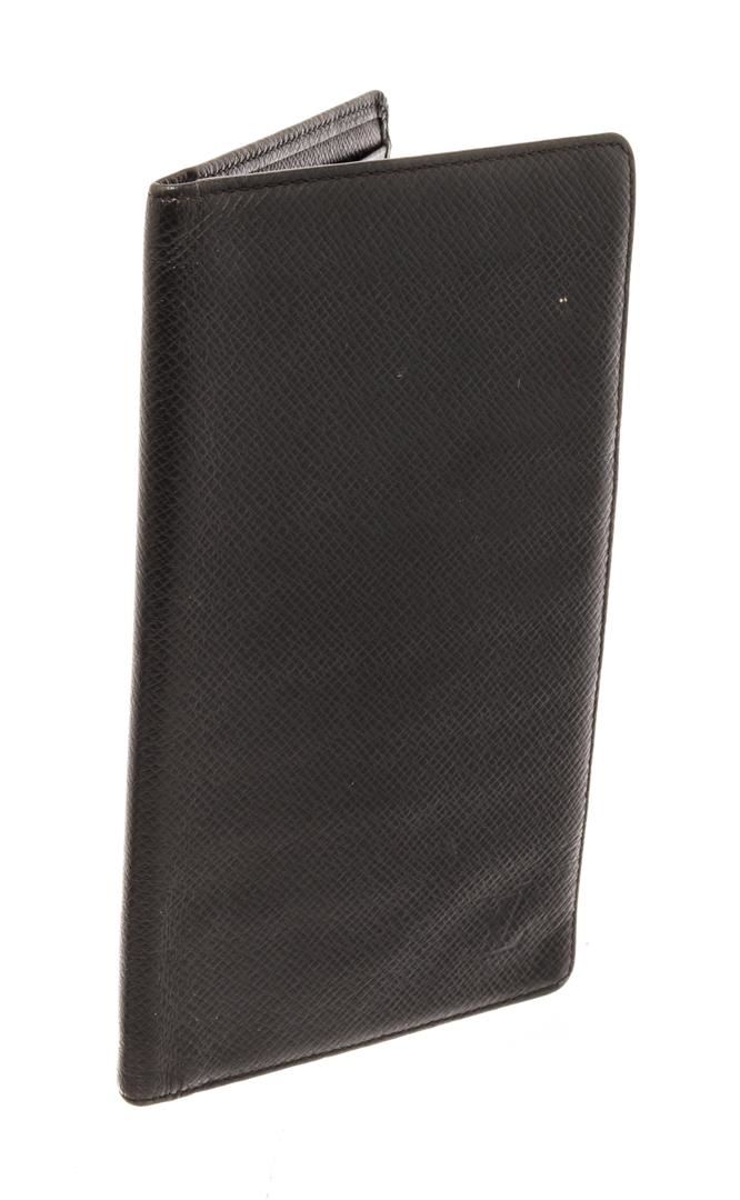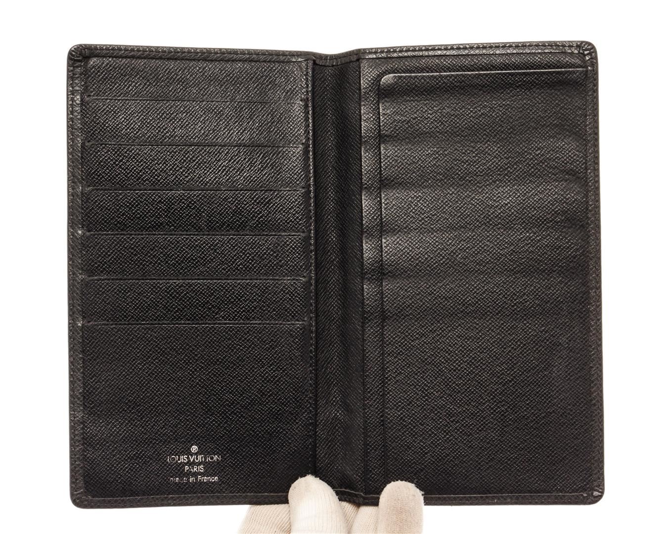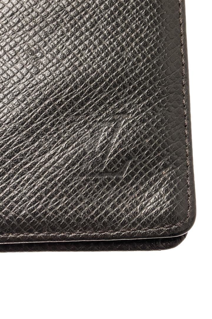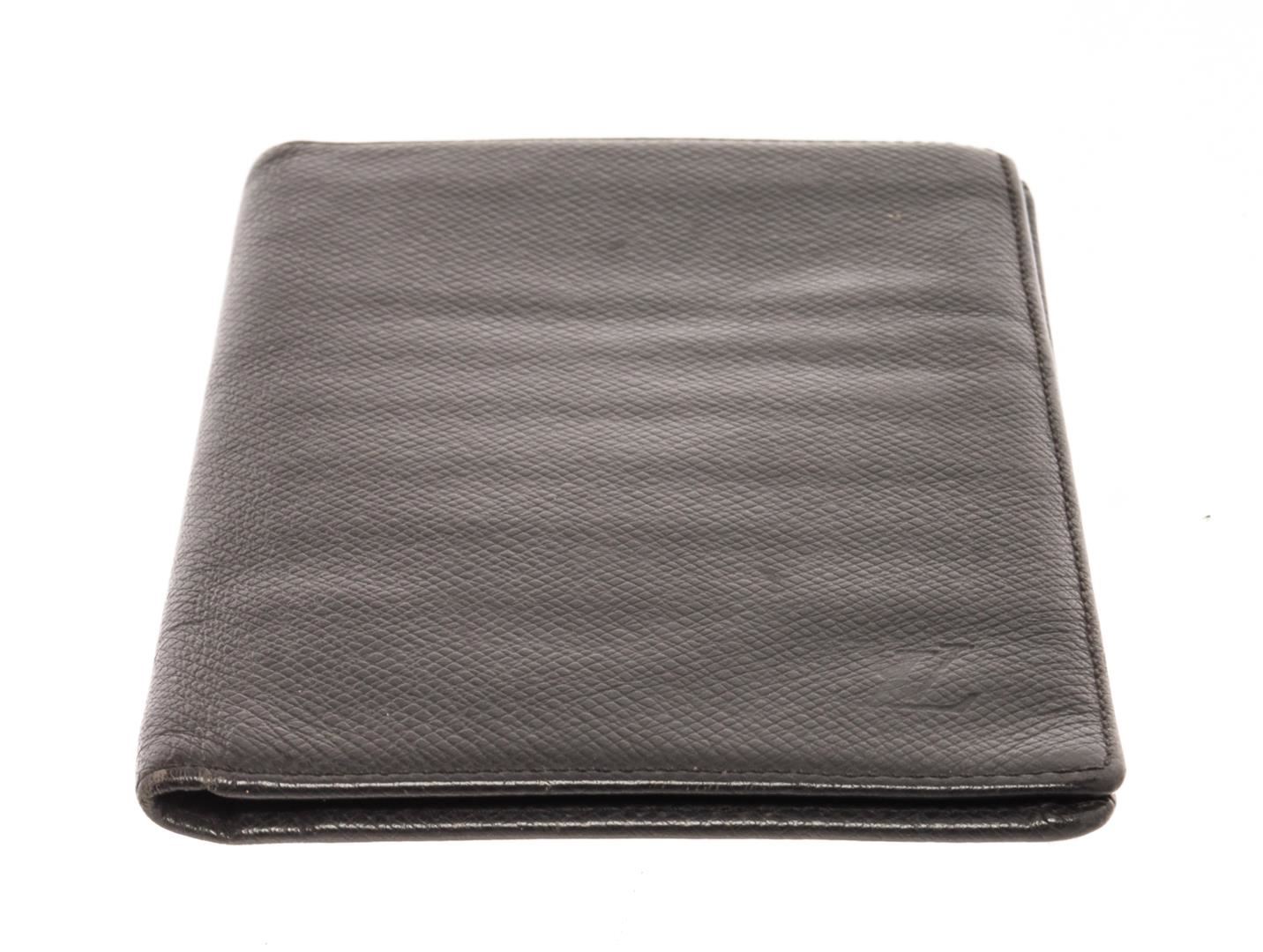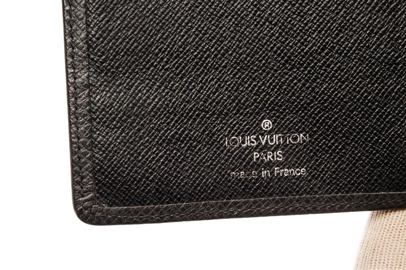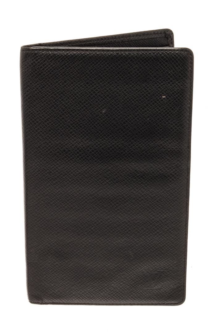 Louis Vuitton Gray Taiga Leather Travel Wallet. All available information is listed in the description and shown in the photos. Louis Vuitton Gray Taiga Leather Travel Wallet with black taiga leather, silver tone hardware, leather lining & three interior pockets with card slots, flap closure. Height: 7.25" Width: 4" Depth: 0.25", / 18.41 x 10.16 x 0.63 Cm