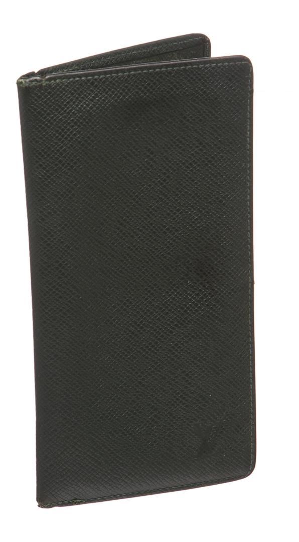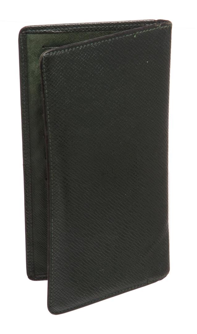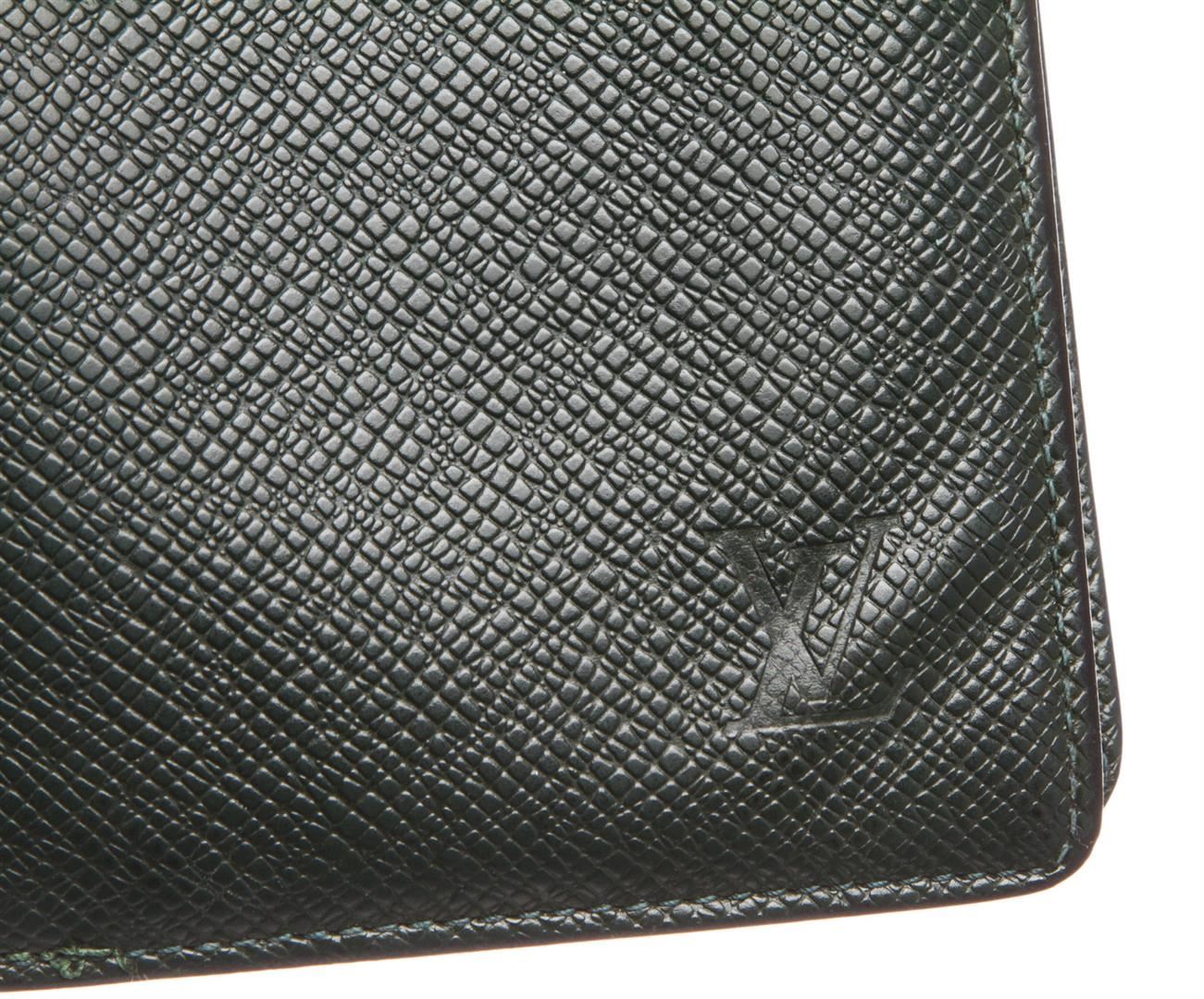Men's green leather Louis Vuitton Taiga Long bifold wallet with 14 card slots and dual cash slots at interior walls.