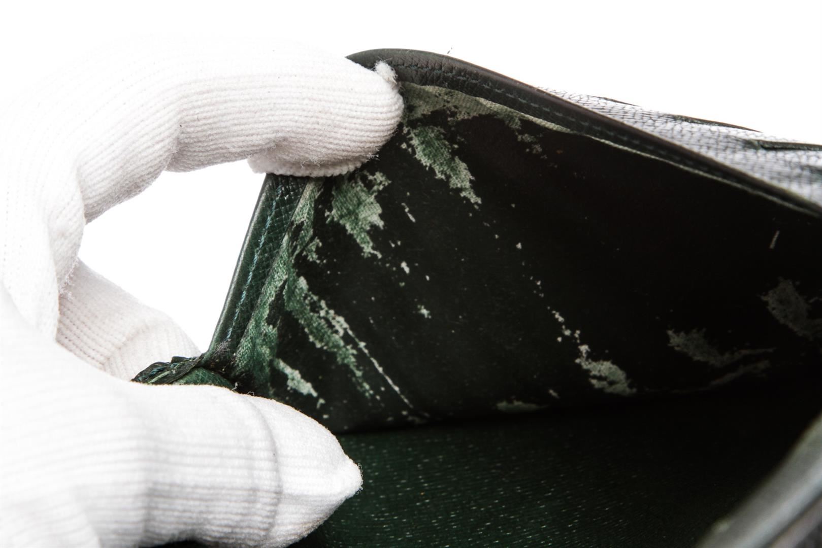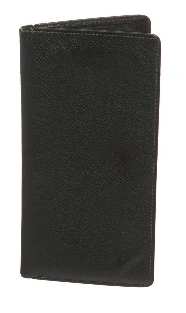 Men's green leather Louis Vuitton Taiga Long bifold wallet with 14 card slots and dual cash slots at interior walls.