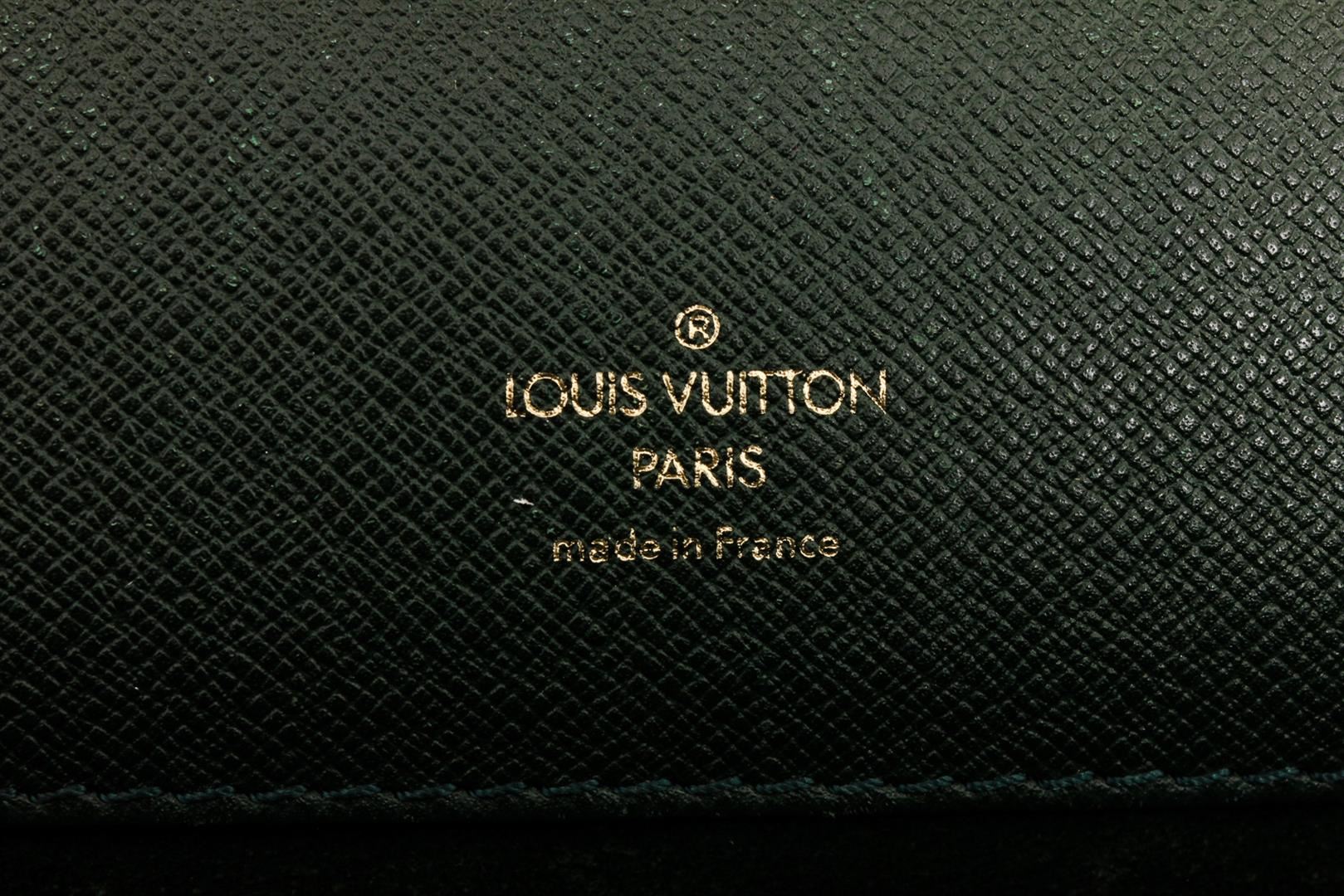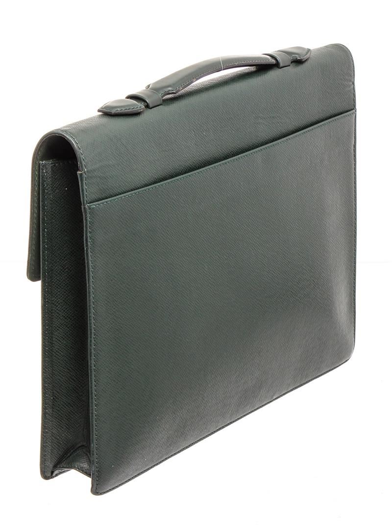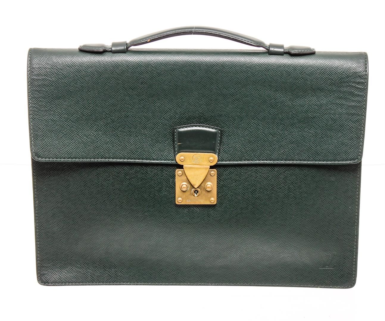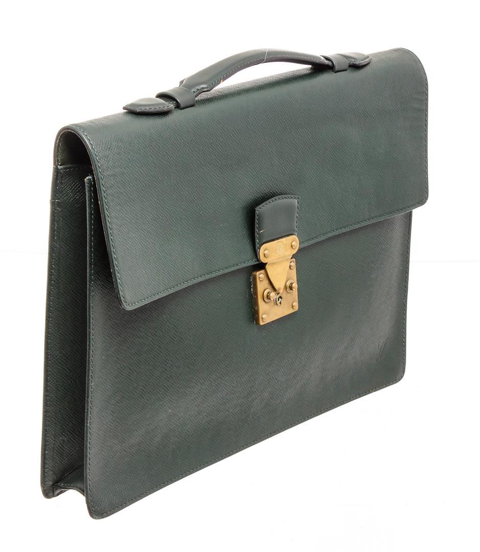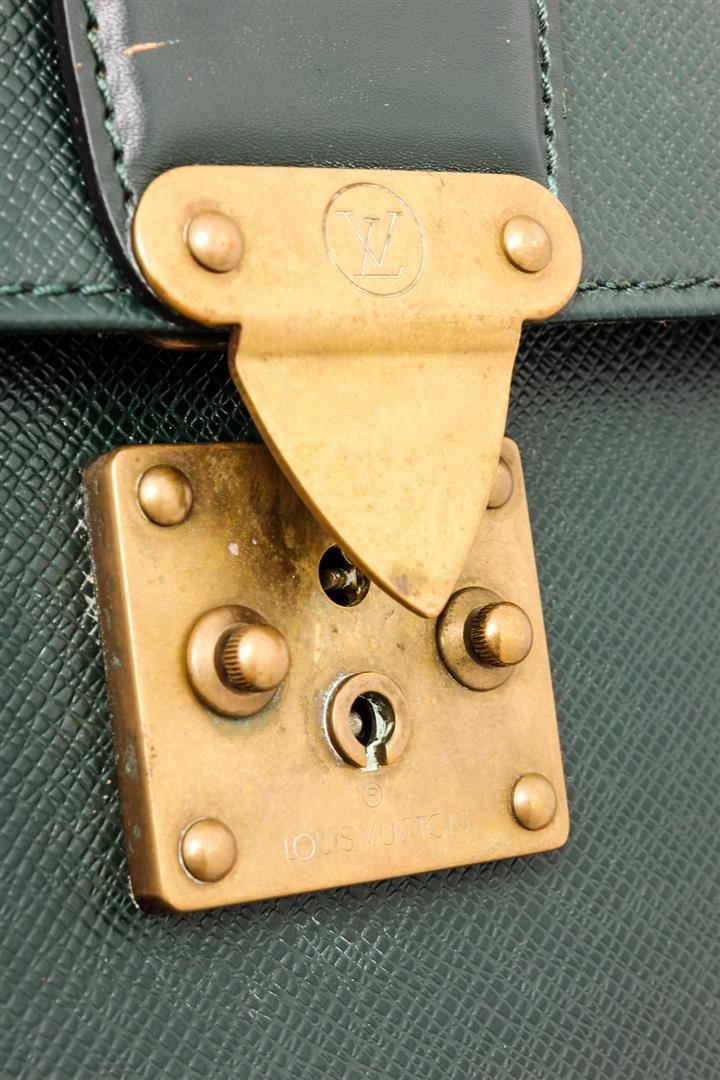 Green Taiga leather vintage Louis Vuitton Serviette Kourad Briefcase with brass hardware, single flat top handle, single exterior slit pocket, tonal hide lining and S-lock closure.