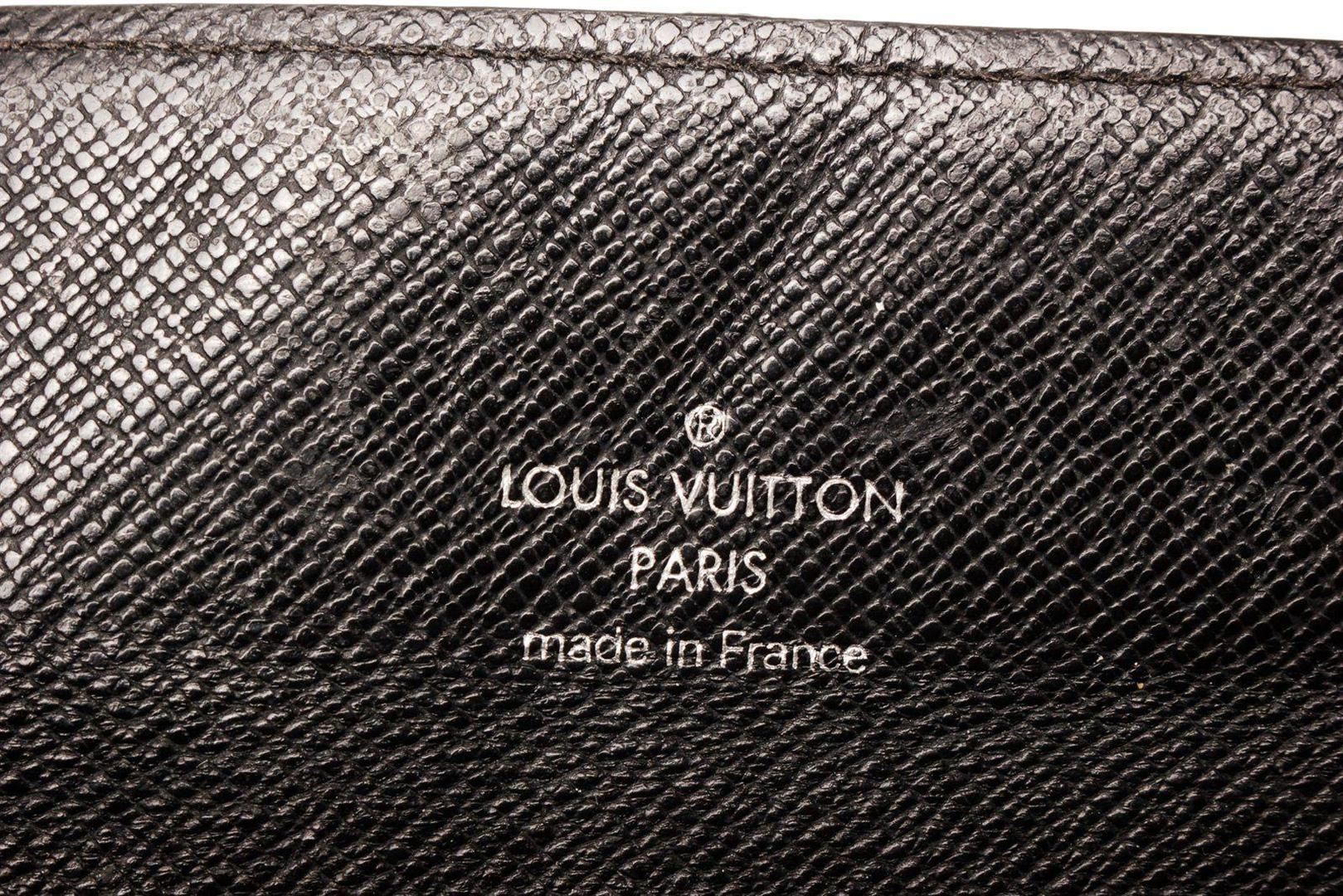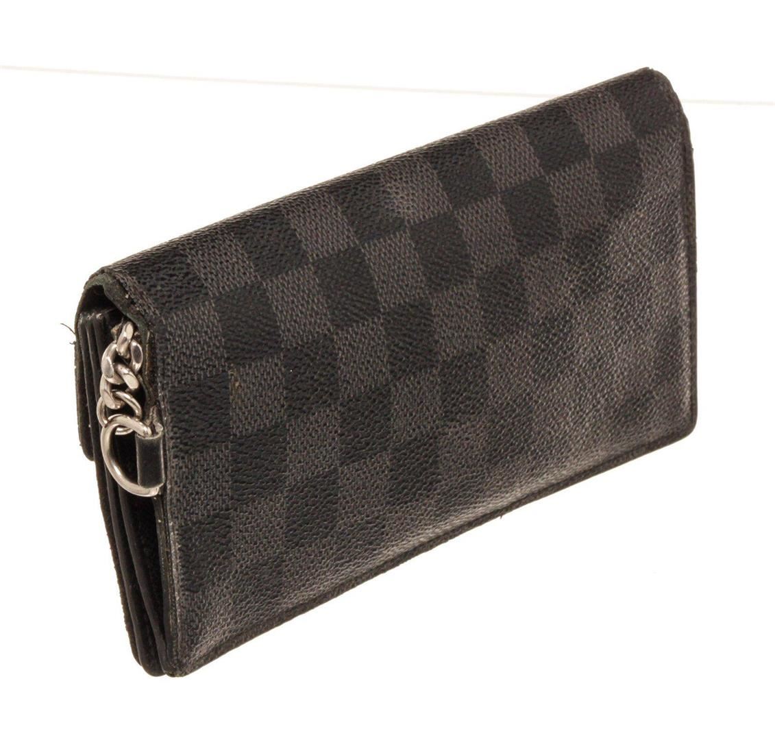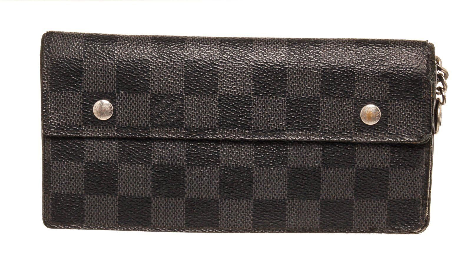 Louis Vuitton Grey Black Damier Canvas Accordian Wallet. All available information is listed in the description and shown in the photos. Louis Vuitton Grey Black Damier Canvas Accordian Wallet with silver-tone hardware, leather lining & three interior pockets with card slots, snap closure.