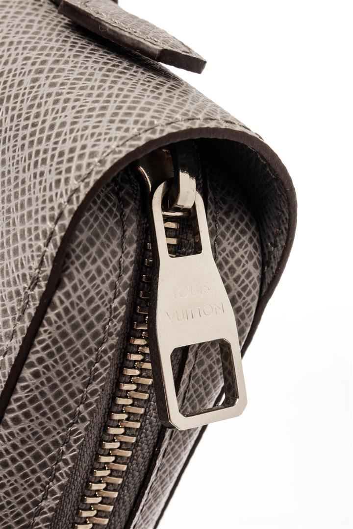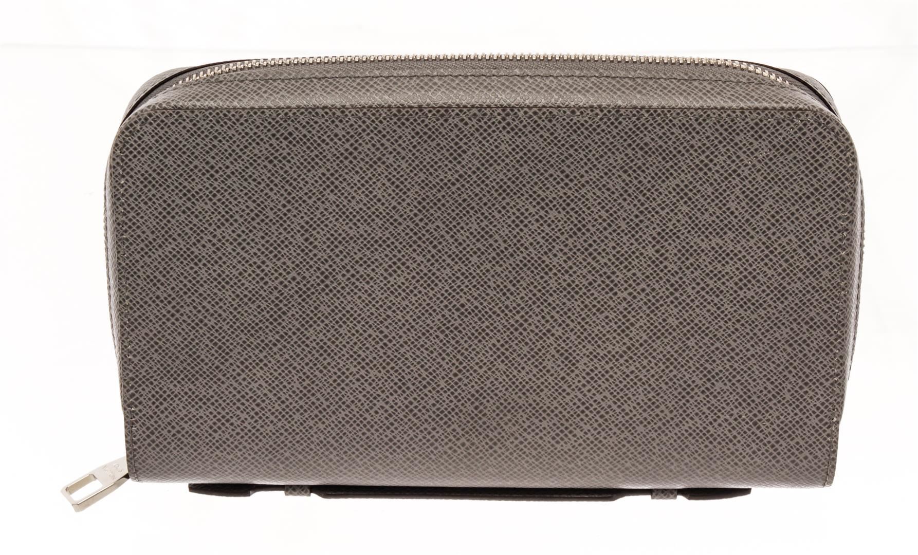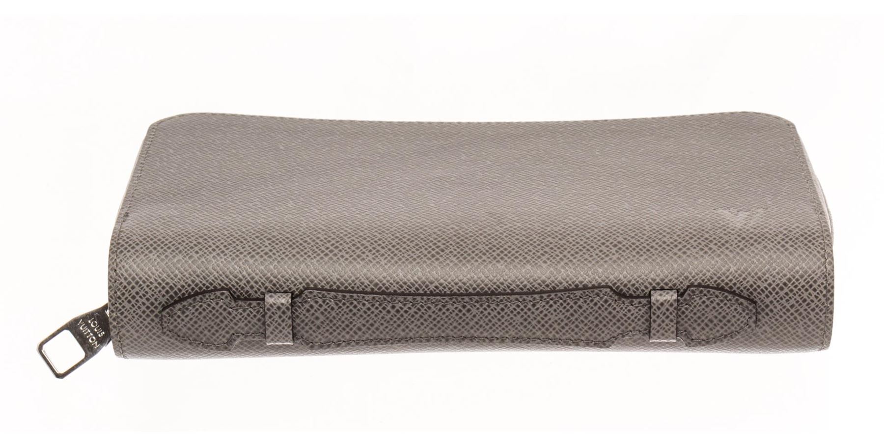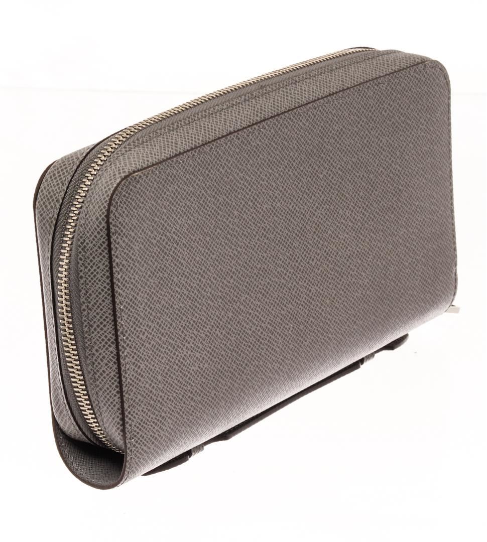 Louis Vuitton Grey Taiga Leather XL Zippy Wallet. All available information is listed in the description and shown in the photos. Louis Vuitton Grey Taiga Leather XL Zippy Wallet with gold-tone hardware, trim tan vachetta leather, slip pocket in interior, zip around closure opens to card slots, Zip around closure.