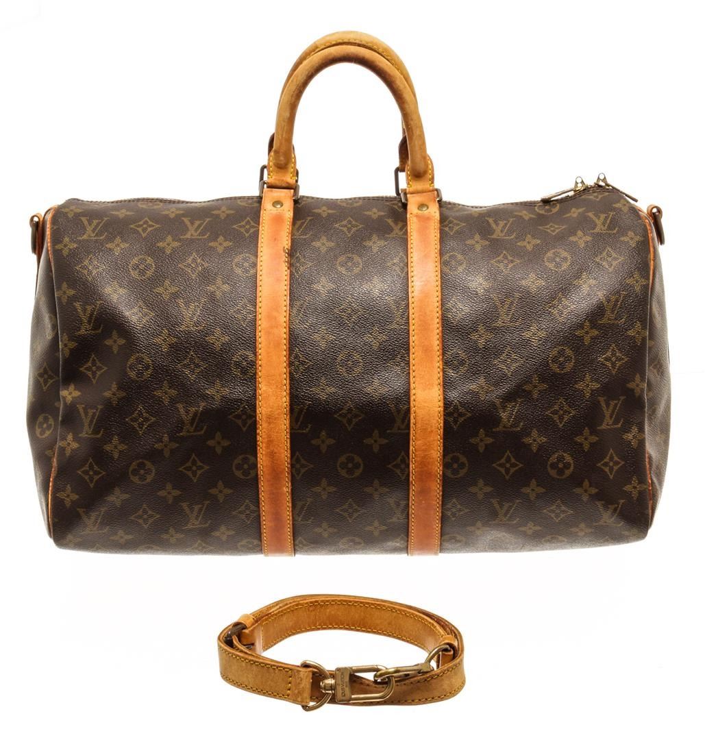 One Louis Vuitton Keepall 45 cm Bandouliere Duffel Bag. Item is sold AS-IS. All available information is listed in the description and shown in the photo. Louis Vuitton Keepall 45 cm Bandouliere duffel bag with monogram coated canvas exterior, contrasting vanchetta leather trims and top handles, brown fabric lining, adjustable and detachable strap, top zipper closure, and gold-tone hardware.