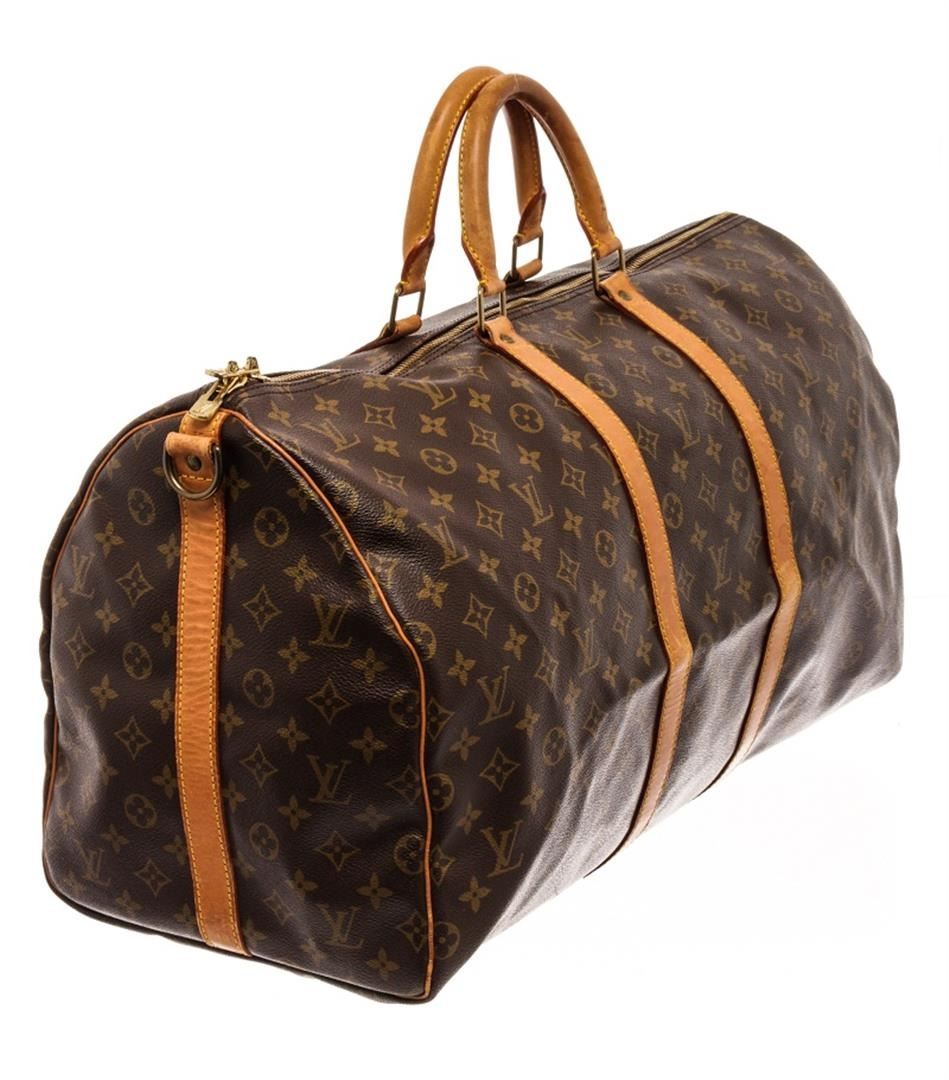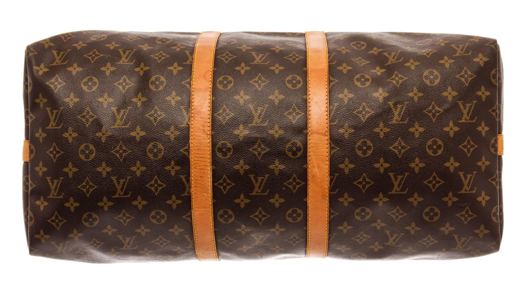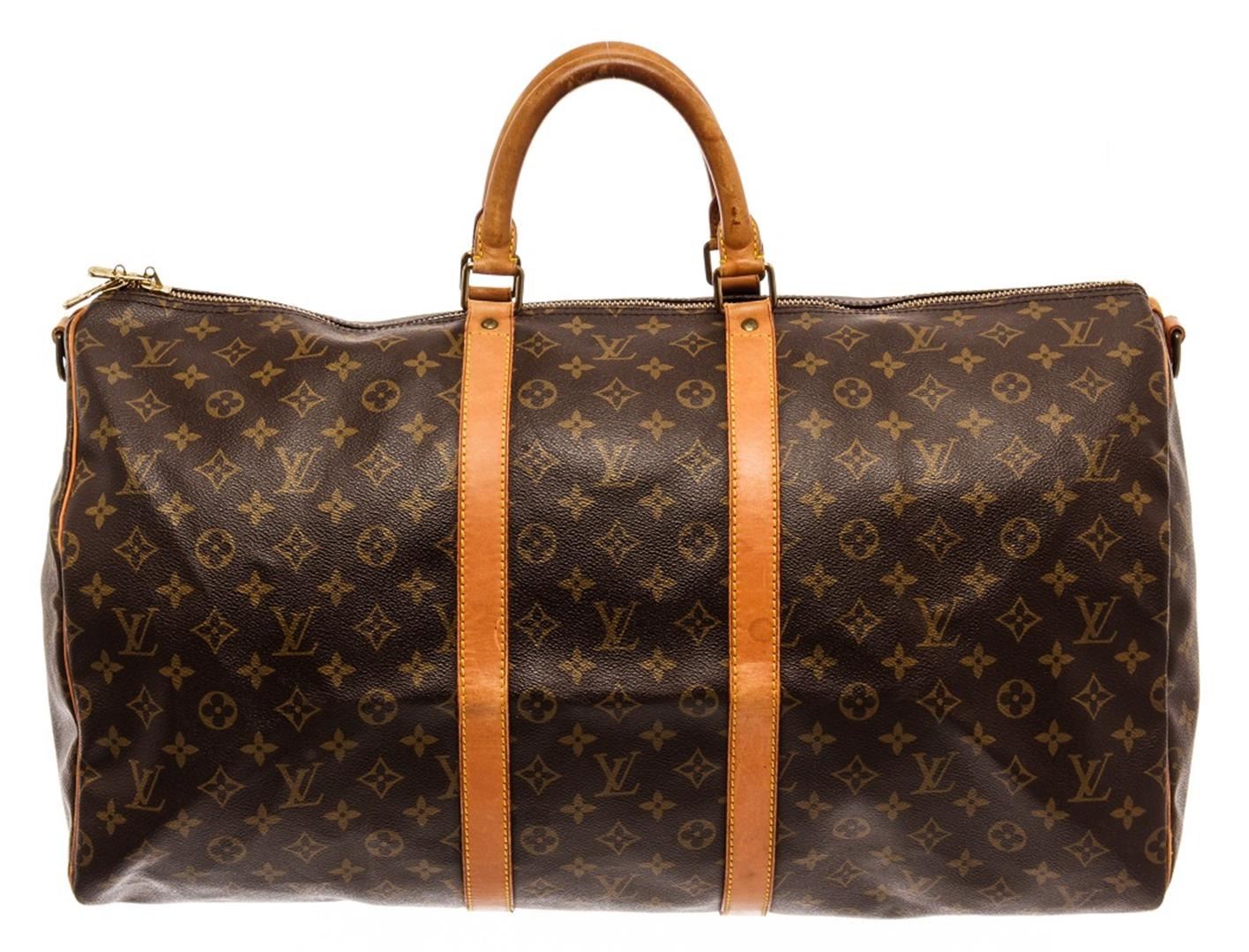 Louis Vuitton Keepall 55 Bandouliere Travel Bag. Brand: Louis Vuitton, Style: Keepall 55 Bandouliere, Type: Travel Bag, Exterior color: Monogram, Exterior material: Coated Canvas, Interior color: Brown, Interior material: Canvas, Length: 22, Width: 12, He