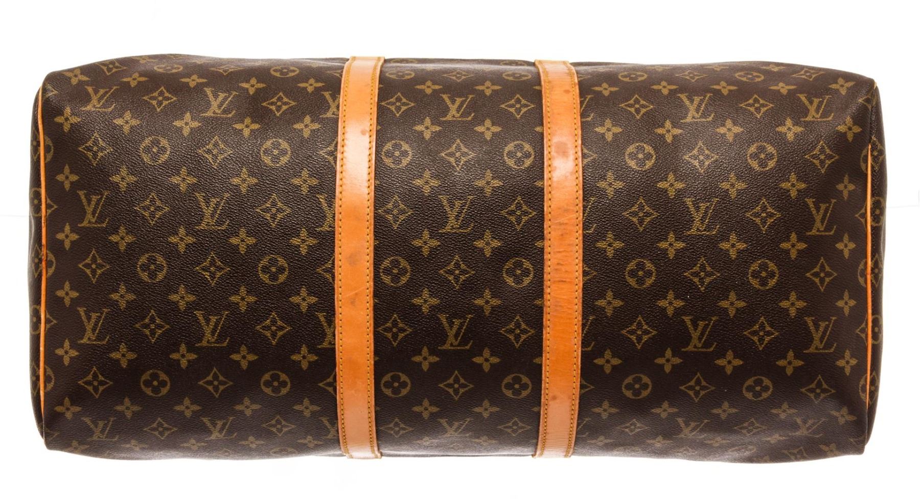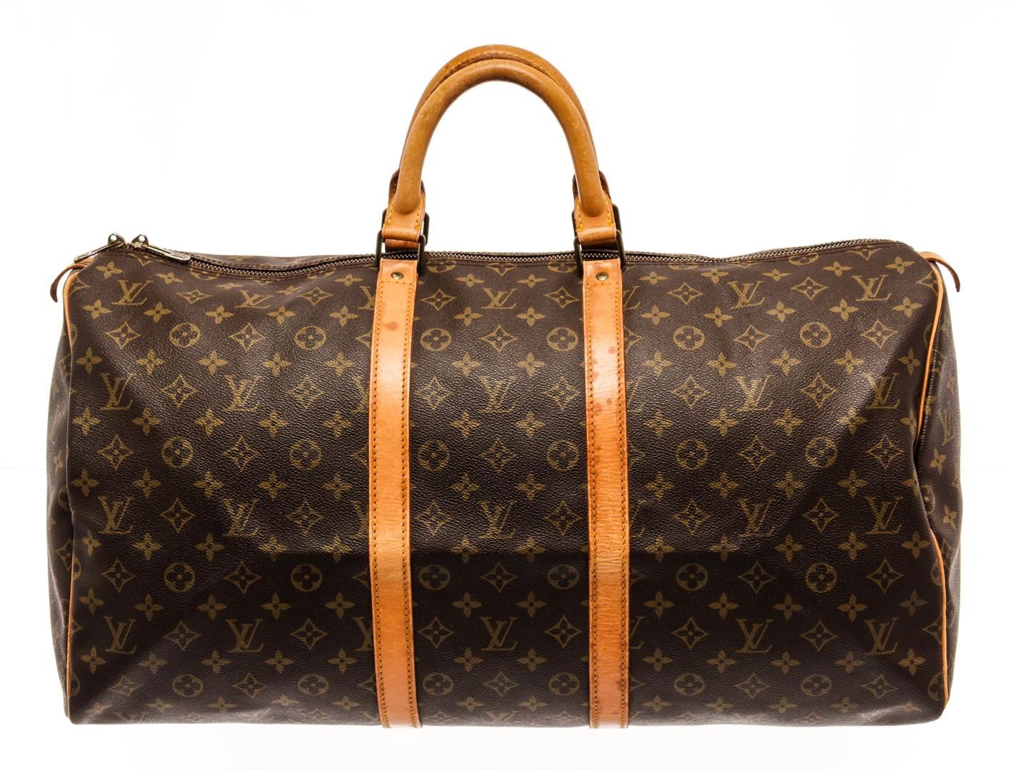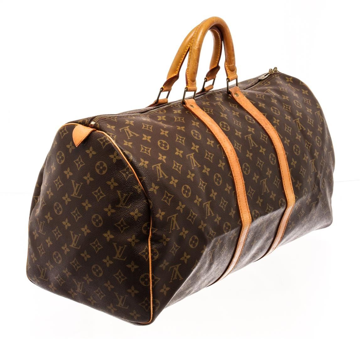 Louis Vuitton Keepall 55 Duffle Bag Brown Monogram Coated Canvas. Brand: Louis Vuitton, Style: Keepall 55, Type: Duffle Bag, Exterior Color: Brown Monogram, Exterior Material: Coated Canvas, Exterior Pockets: None, Interior Color: Brown, Interior Material: Canvas, Interior Pockets: One, Closure: Zip, Handle/Strap Type: Top Handle, Length: 9, Width: 22, Height: 12, Handle Drop: 4. Condition: Vachetta is stained and creased. Item is sold AS-IS and all information pertaining to this lot is available in the photos or this description.