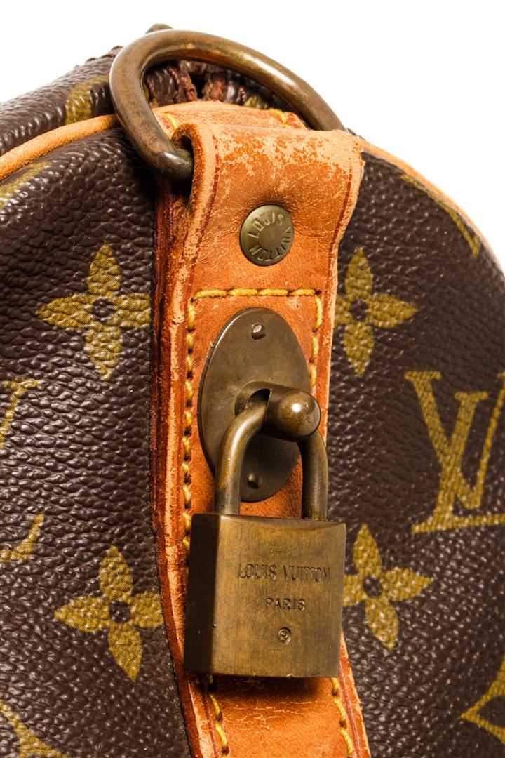 One Louis Vuitton Keepall Bandouliere 45 cm Duffel Bag. Item is sold AS-IS. All available information is listed in the description and shown in the photo. Louis Vuitton Keepall Bandouliere 45 cm duffel bag with monogram coated canvas exterior, contrasting vanchetta leather trims and top handles, brown fabric lining, top zipper closure, lock, gold-tone hardware, and adjustable and detachable strap.