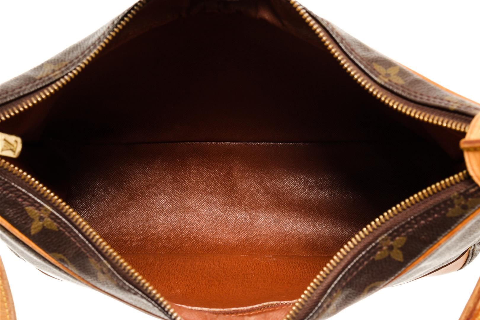 One Louis Vuitton Monogram Boulogne PM Shoulder Bag. Item is sold AS-IS. All available information is listed in the description and shown in the photo. Louis Vuitton Monogram Boulogne PM shoulder bag with coated canvas exterior, brown leather lining, contrasting vachetta leather trims and adjustable top handle, gold-tone hardware, zip closure, and one main compartment.