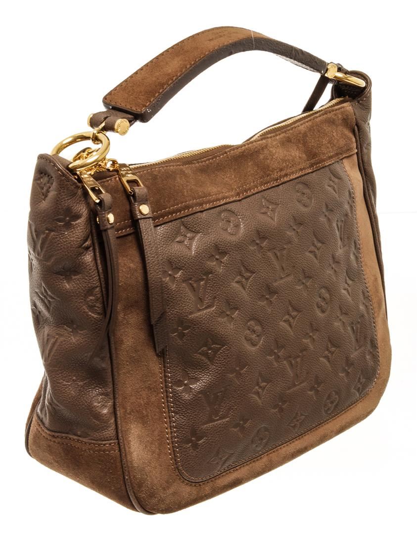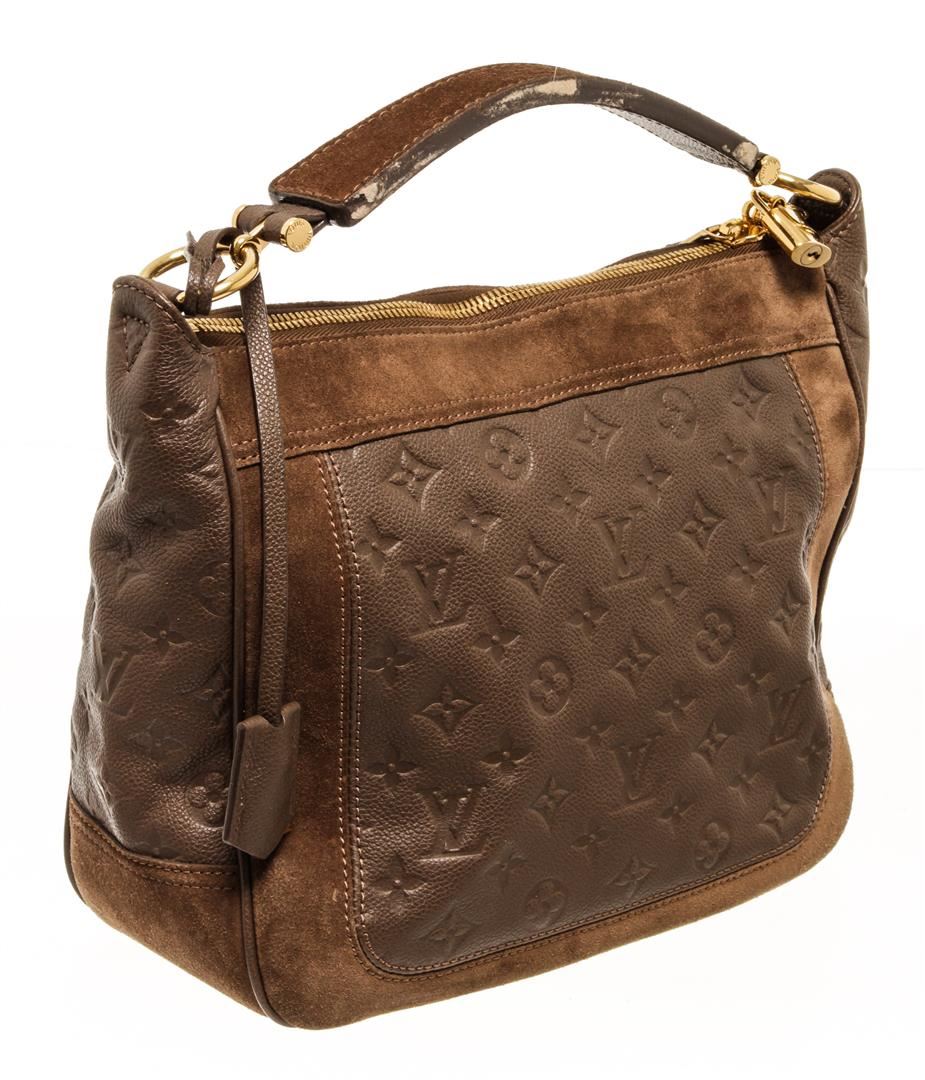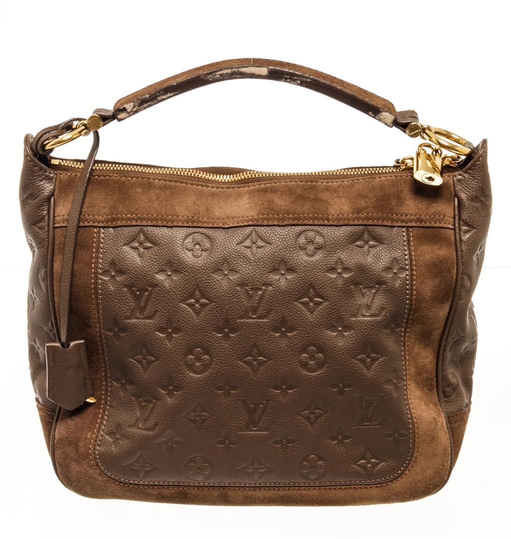 One Louis Vuitton Monogram Brown Calfskin Audacieuse Handbag. Item is sold AS-IS. All available information is listed in the description and shown in the photo. Louis Vuitton monogram brown calfskin Audacieuse handbag with embossed calfskin and brown suede exterior, brown fabric lining, brown leather top handle, adjustable and detachable long strap, gold-tone hardware, and zipper closure.
