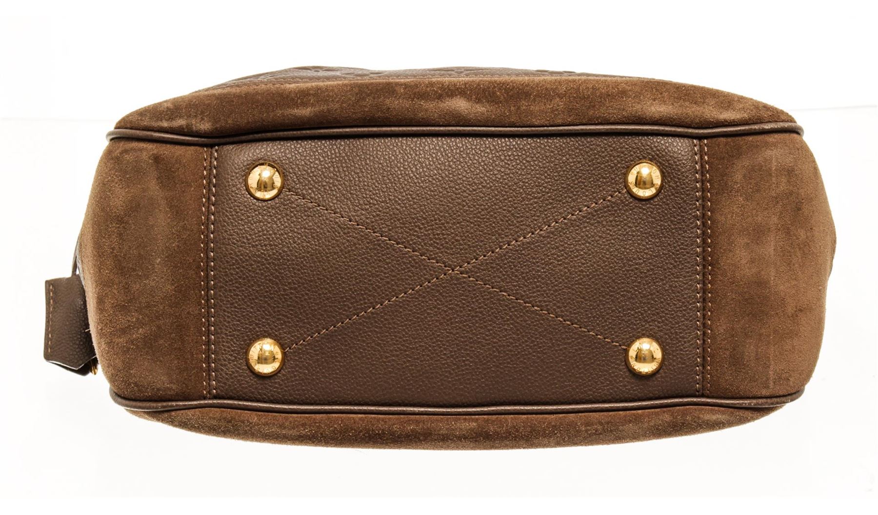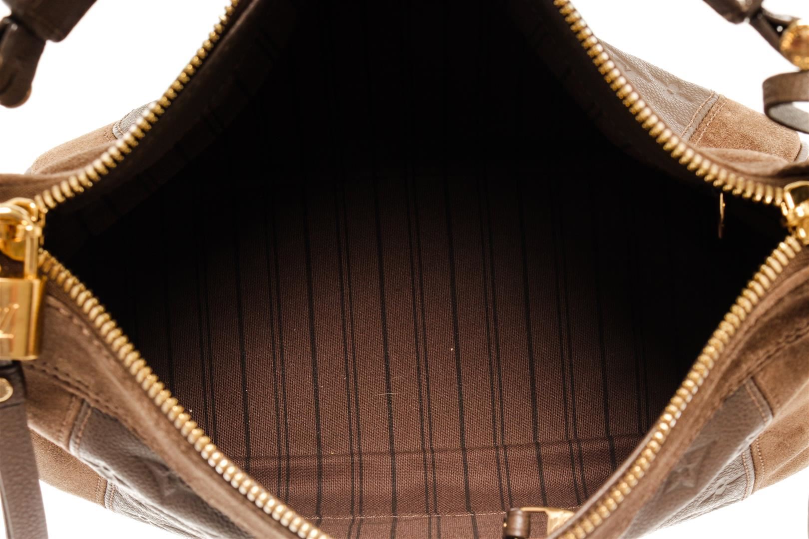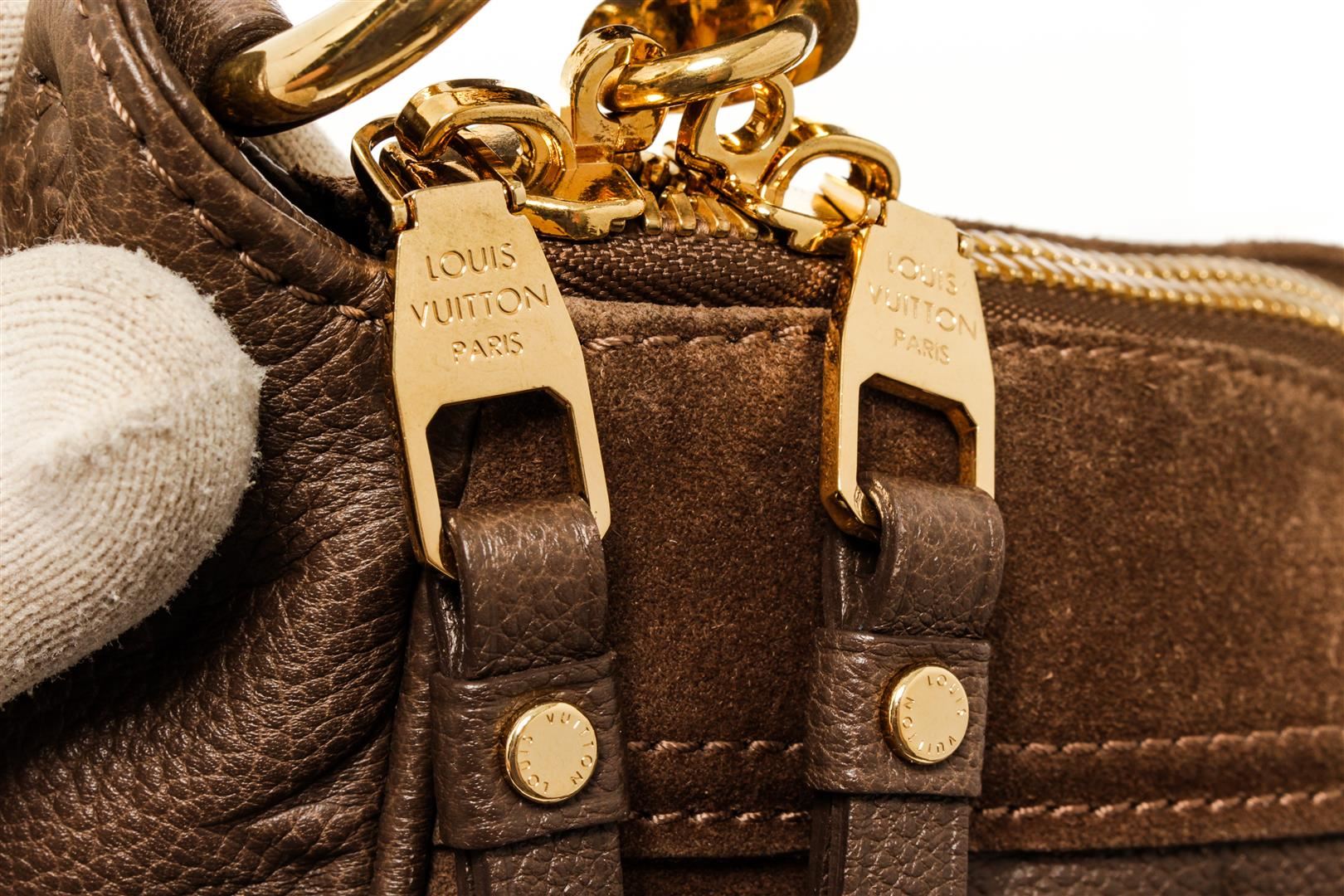 One Louis Vuitton Monogram Brown Calfskin Audacieuse Handbag. Item is sold AS-IS. All available information is listed in the description and shown in the photo. Louis Vuitton monogram brown calfskin Audacieuse handbag with embossed calfskin and brown suede exterior, brown fabric lining, brown leather top handle, adjustable and detachable long strap, gold-tone hardware, and zipper closure.