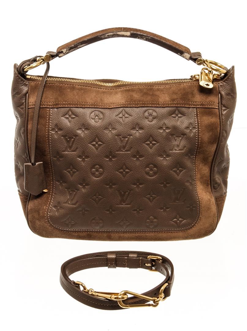 One Louis Vuitton Monogram Brown Calfskin Audacieuse Handbag. Item is sold AS-IS. All available information is listed in the description and shown in the photo. Louis Vuitton monogram brown calfskin Audacieuse handbag with embossed calfskin and brown suede exterior, brown fabric lining, brown leather top handle, adjustable and detachable long strap, gold-tone hardware, and zipper closure.
