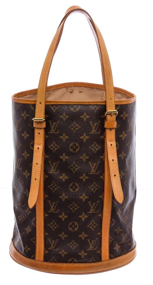 Brown and tan monogram Louis Vuitton Bucket GM with brass hardware, tan vachetta leather accents, dual flat shoulder straps, beige Taiga leather interior and dual pockets; one with zip closure at interior walls. PLEASE NOTE: Interior is pealing and sticky.
