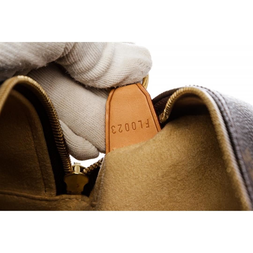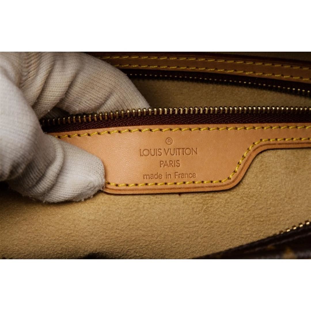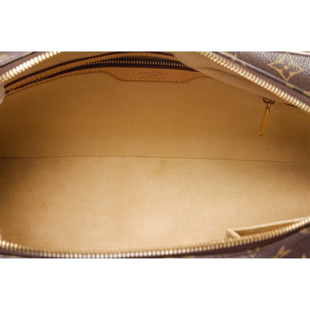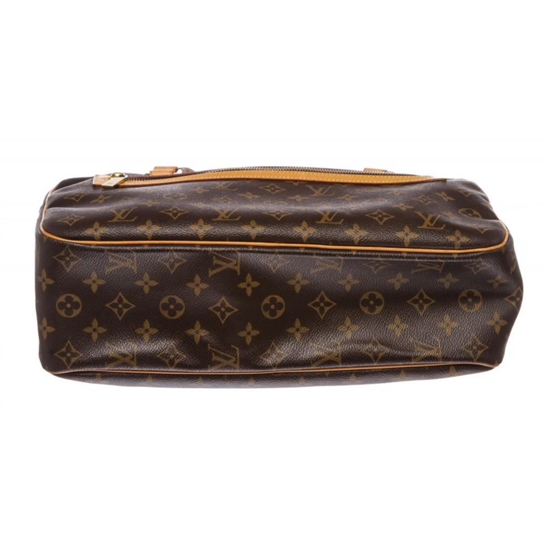 Brown and tan monogram coated canvas Louis Vuitton Cite GM with brass hardware, tan vachetta trim, single zip pocket at exterior, dual flat shoulder straps, beige Alcantara lining, three interior pockets; one with zip closure and two-way zip closure at top. Item is pre-owned.