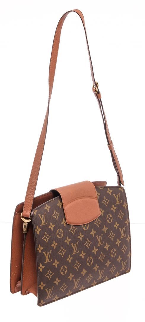 Brown and tan Louis Vuitton coated canvas monogram Courcelles shoulder bag with adjustable strap, brass hardware, two interior compartments, two zippered pockets and top flap closure.