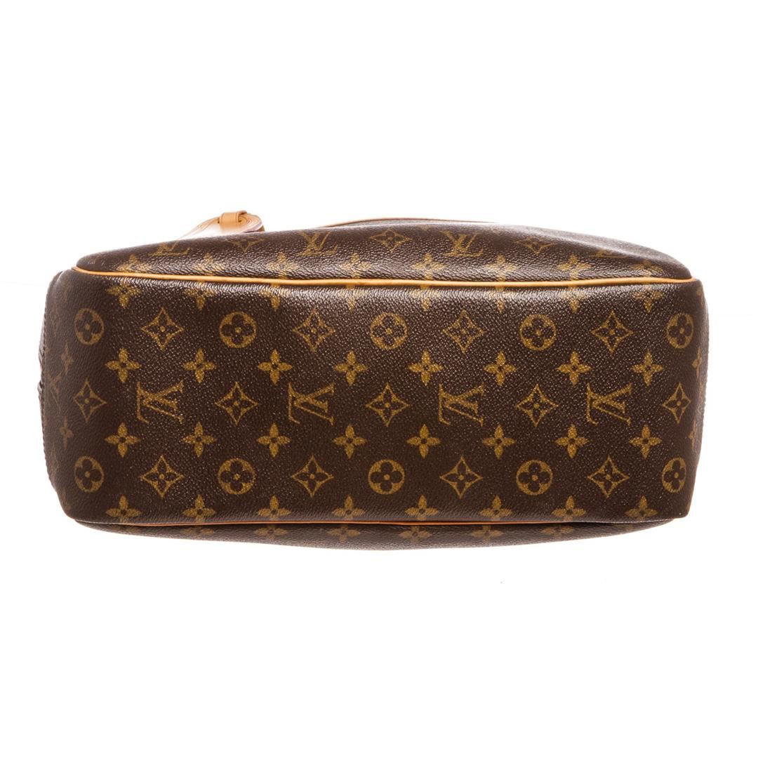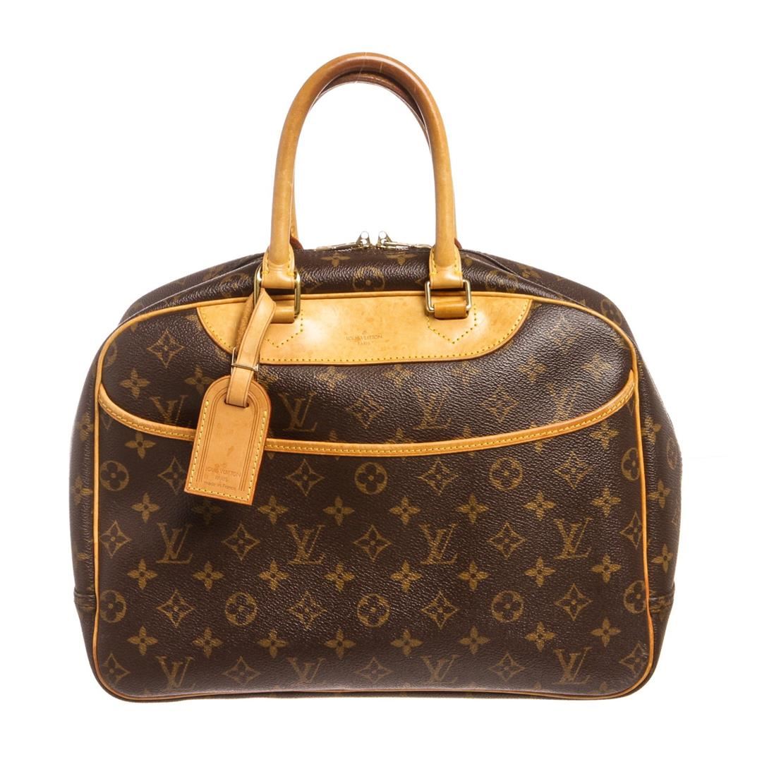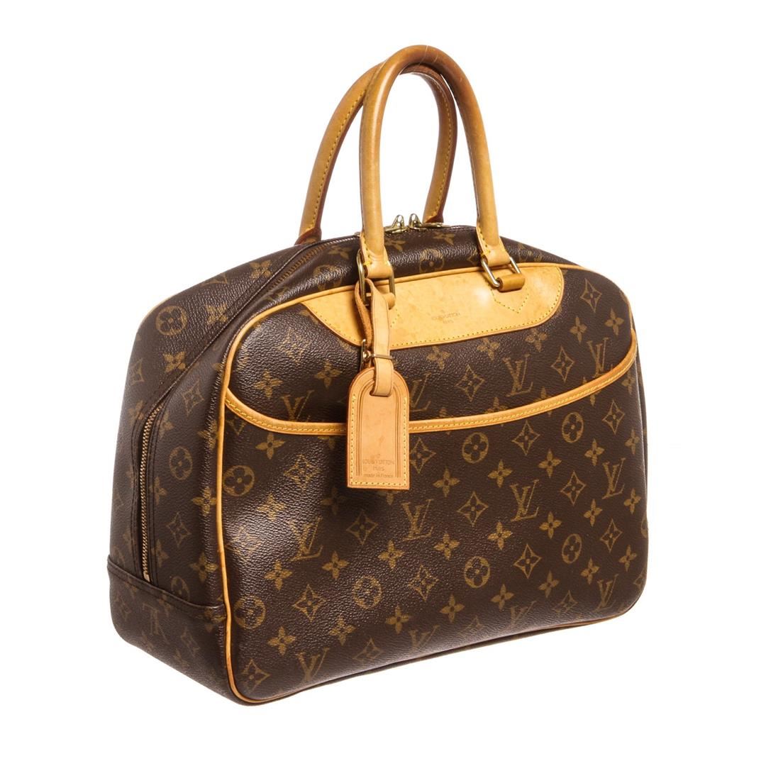 Brown and tan monogram coated canvas Louis Vuitton Deauville Bag with brass hardware, tan vachetta leather lining, dual rolled handles, single open compartment at exterior front, creme canvas lining, four open pockets at interior wall and two-way zip clos Item is pre-owned. Item Dimensions: 13"x5"x10"xBag Drop:4"/33cmx12.7cmx25.4cmxBag Drop:10.1cm.