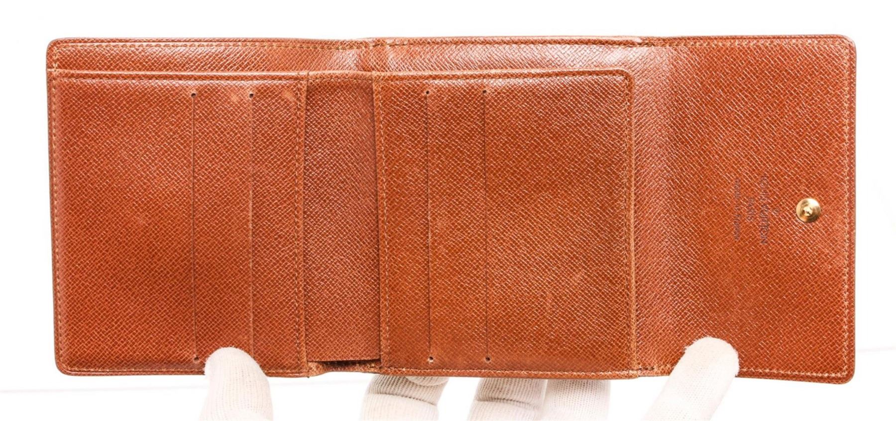 Brown and tan monogram coated canvas Louis Vuitton Elise compact wallet with gold-tone hardware, brown Taiga leather lining, dual compartments at exterior featuring snap closure, dual bill compartments at interior walls, single card slot and snap closure at exterior back.