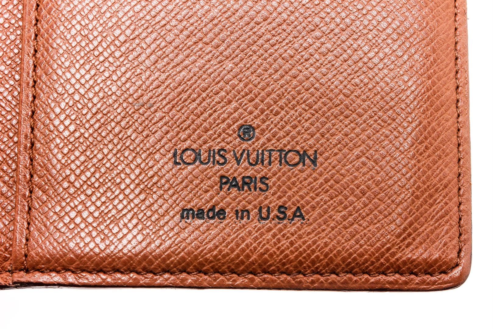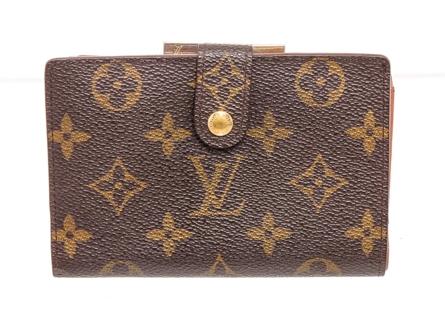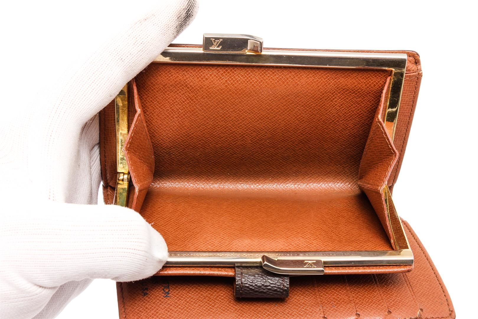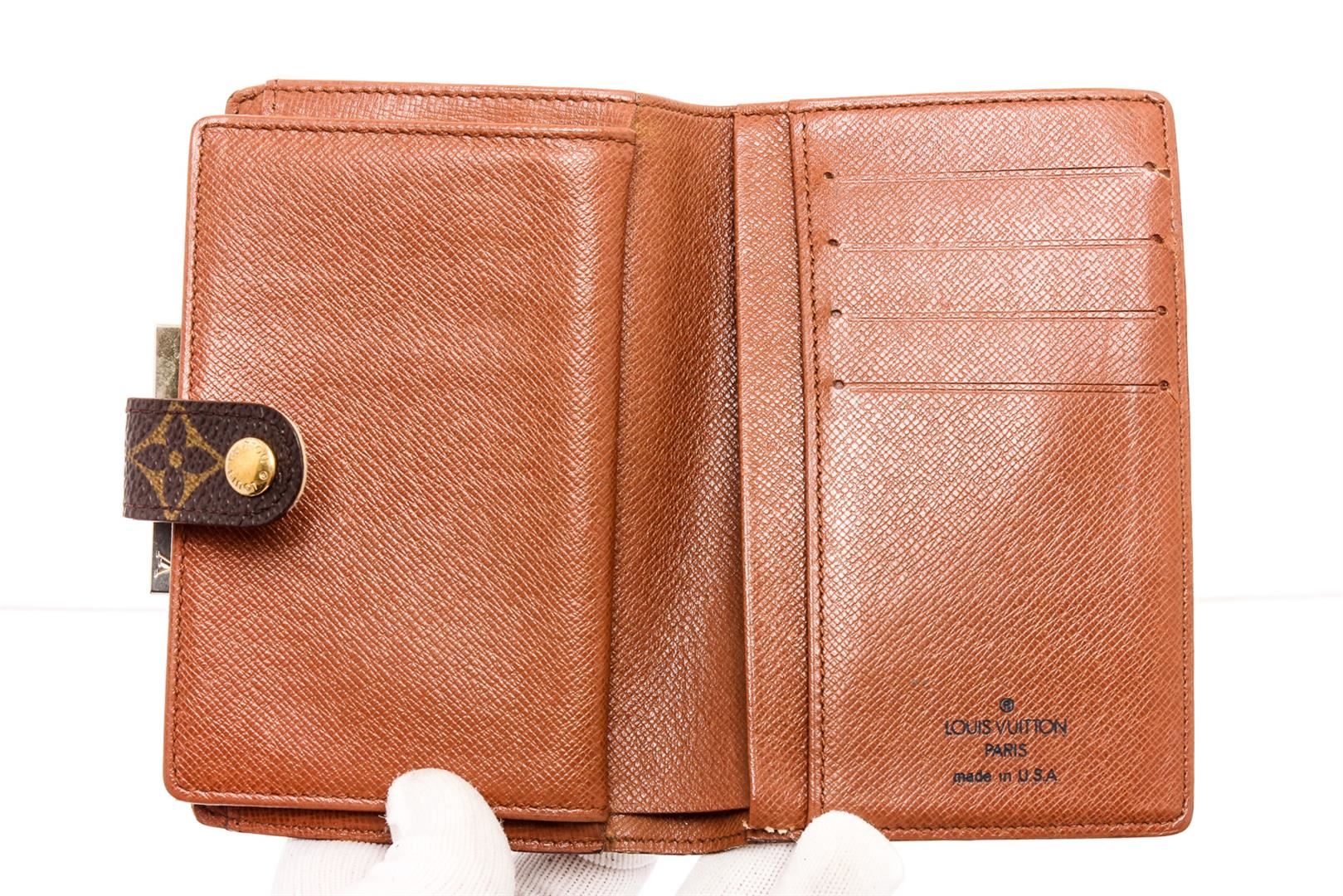 Brown and tan monogram coated canvas Louis Vuitton French Purse wallet with brass hardware, exterior compartment with kiss-lock closure, cinnamon Taiga leather lining, six card slots, single bill compartment and snap closure at front flap. Please note: Peeling on inside pocket.