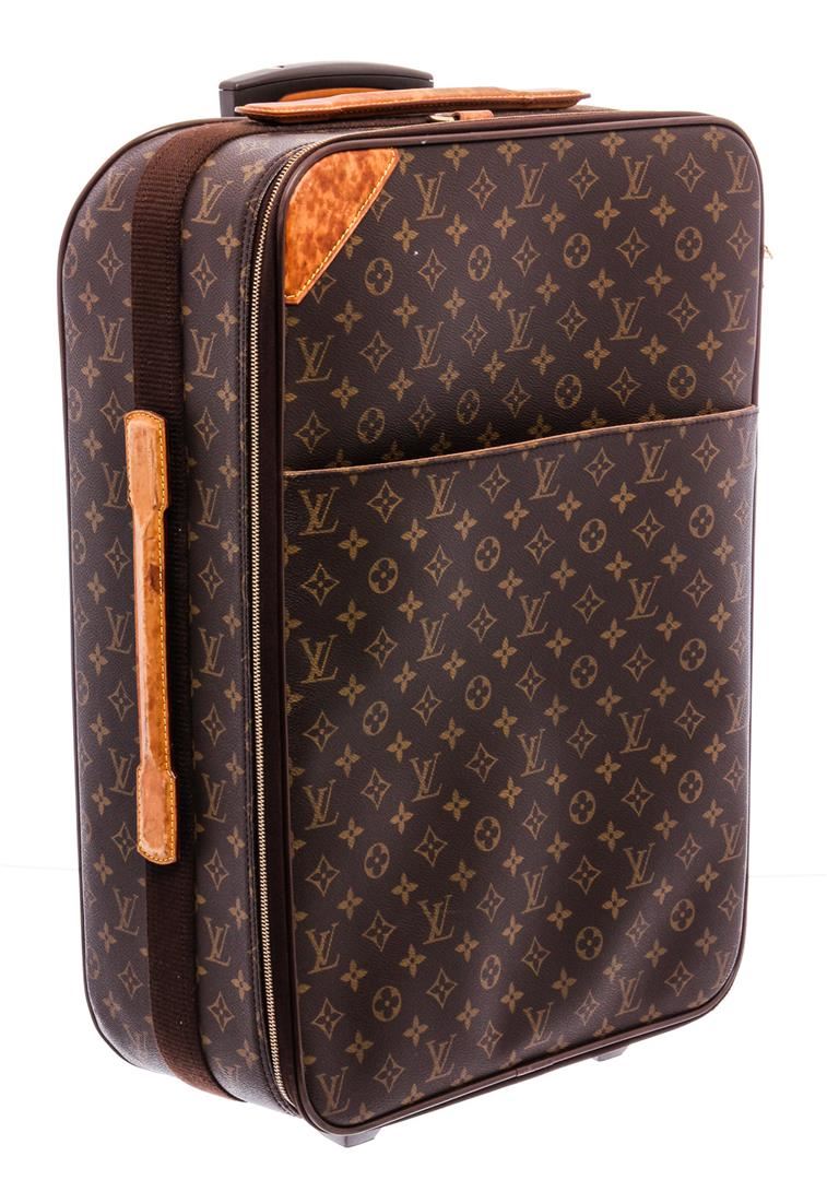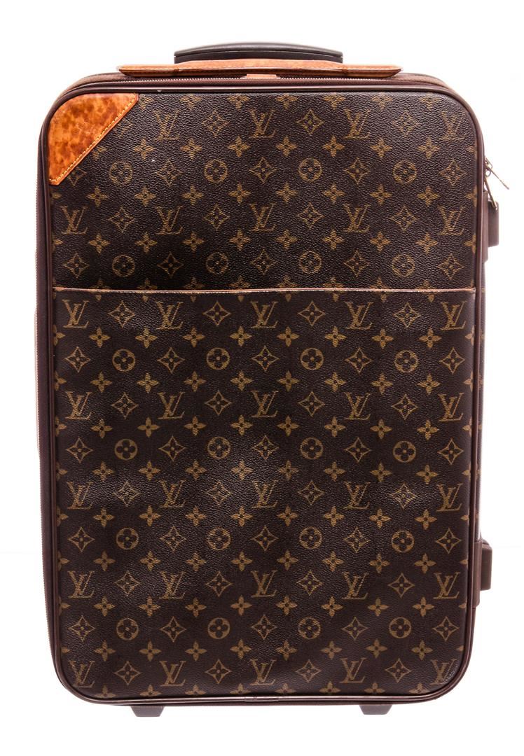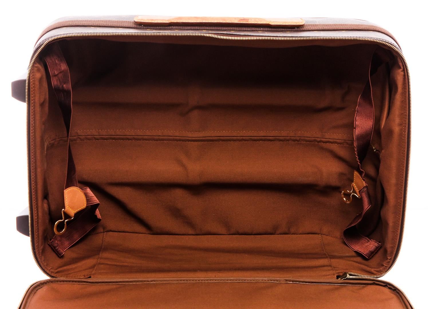 Brown and tan monogram coated canvas Louis Vuitton Pégase 50 with brass hardware, tan vachetta leather trim, single flat top handle, retractable pull handle at top, single exterior zip pocket, dual wheels and protective feet at base, brown nylon lining, compression flaps at interior with velcro closures, dual interior zip pockets and two-way zip closure at exterior.